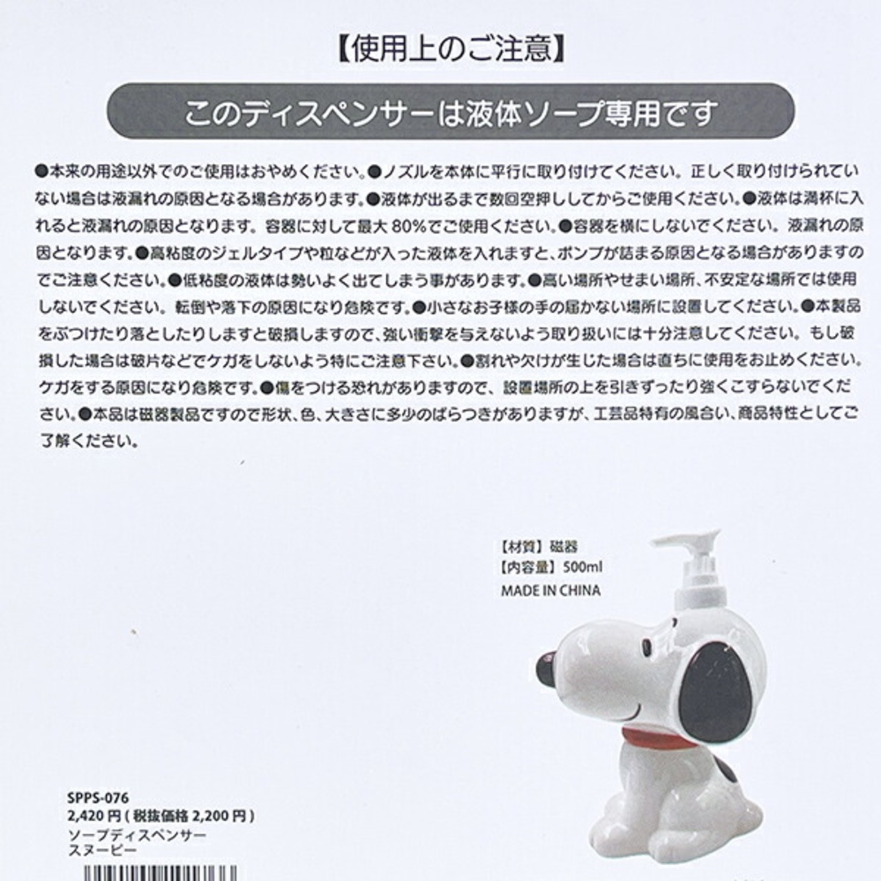 可愛いスヌーピーのソープディスペンサーです。お風呂場のシャンプーやリンスなどを入れるのにぴったり☆バスルームや洗面台周りが華やかにいかがでしょうか?【容量:500ml】