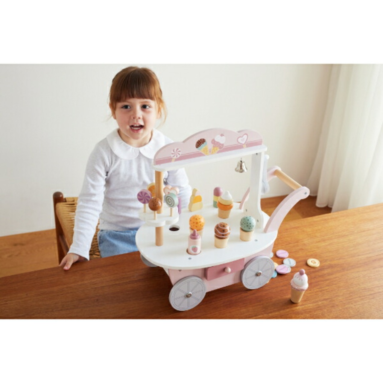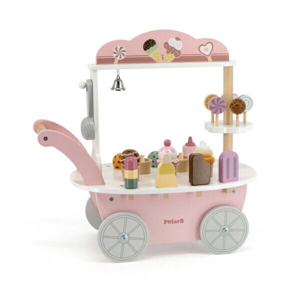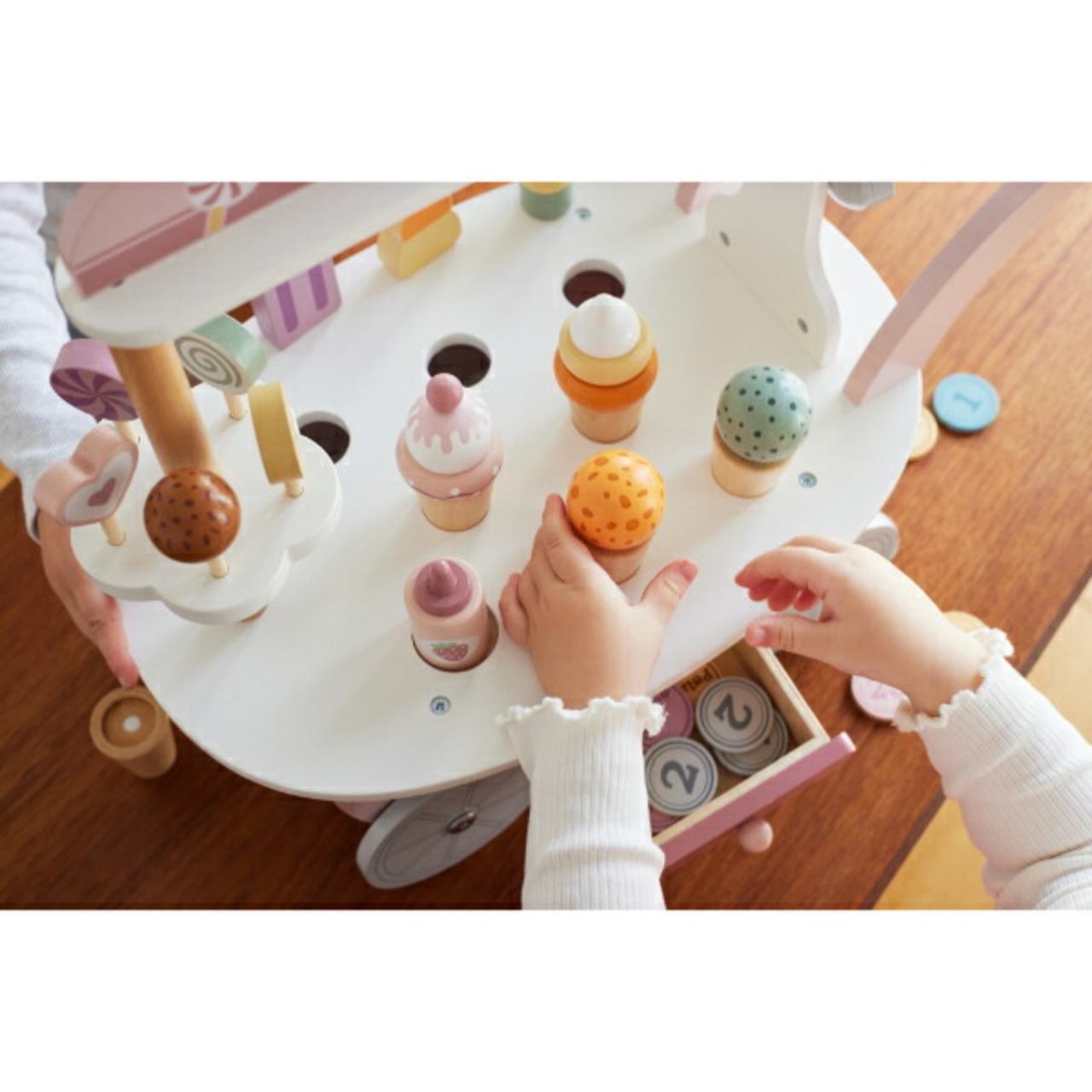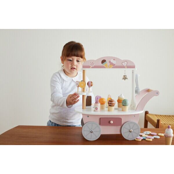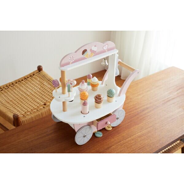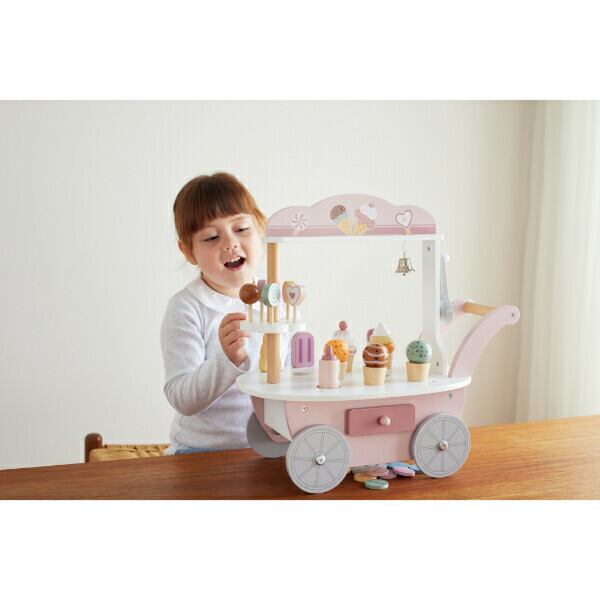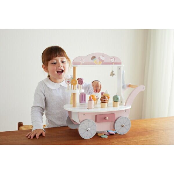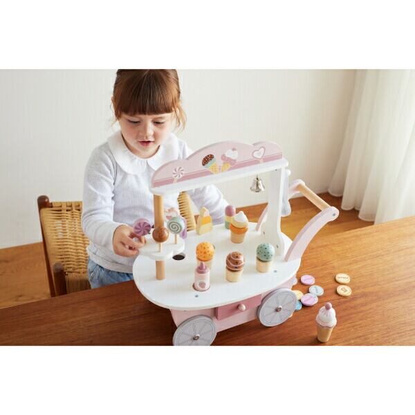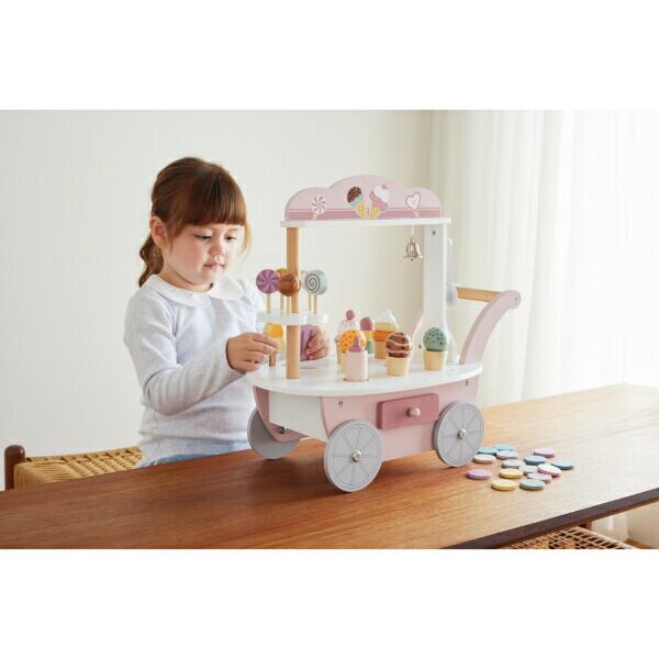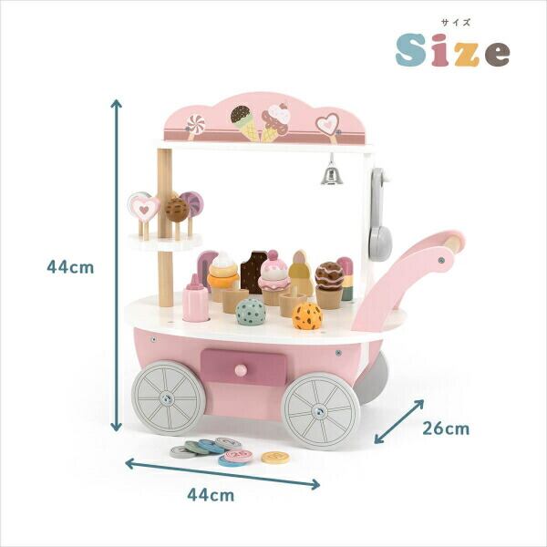 キュートなアイスがいっぱい!たのしいお店屋さんごっこができるアイスワゴンです。アイスクリーム、ソフトクリーム、アイスキャンディー、キャンディー、ソースボトル、スクープ、コインがついたアイスワゴン♪アイスクリームとコーンは自由に組み合わせられるので、遊びの幅が広がります!カートの後ろには引き出し付きで、コインを使って楽しいお店屋さんごっこができちゃいます☆付属のコインで楽しく数字にふれられるのもgood♪カラフルな色味とかわいいデザインなのでギフトにもぴったりなアイテムです☆彡【セット内容】アイスワゴン本体:1台、アイスクリーム:3個、ソフトクリーム:2個、アイスクリームコーン:3個、ソフトクリームコーン:2個、アイスキャンディ:4本、キャンディ:5個、スクープ:1個、ソースボトル:1本、コイン:20枚※この商品は組み立てが必要です。組立ての際はお子さまが近くにいない事を確認し、必ず保護者の方が行ってください。