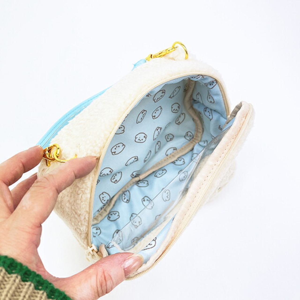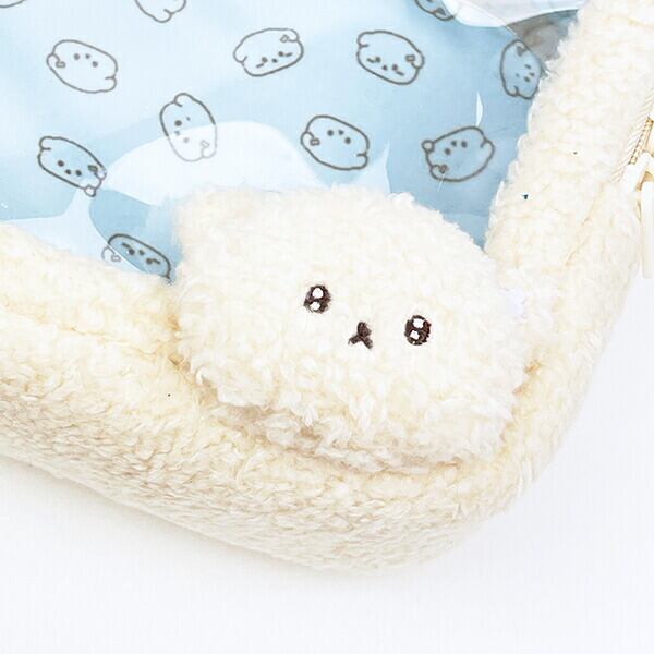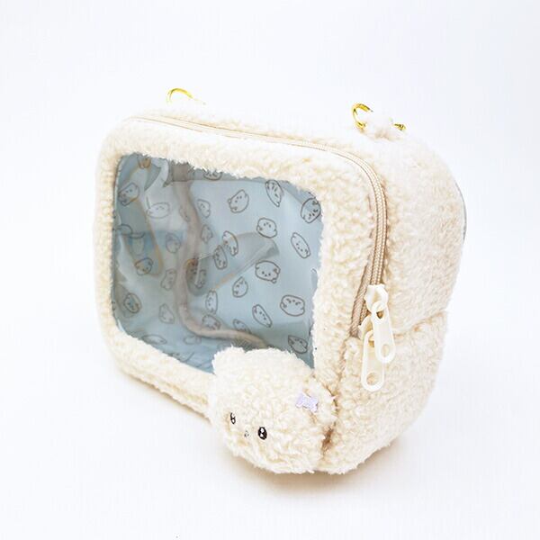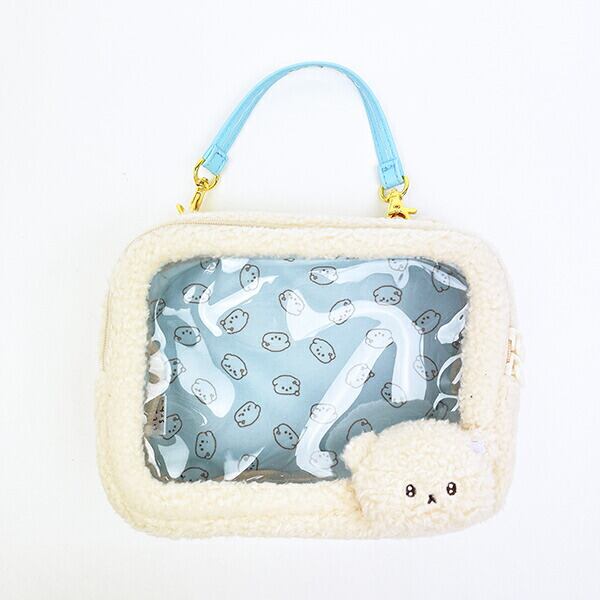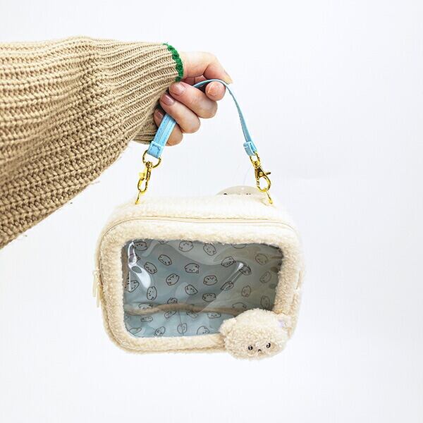 ぬい活に便利なぬいぐるみポーチです。前面がクリア素材なので中のぬいぐるみがしっかり見えます。取っ手は片側が外せるので、バッグに付けて持ち運べます。