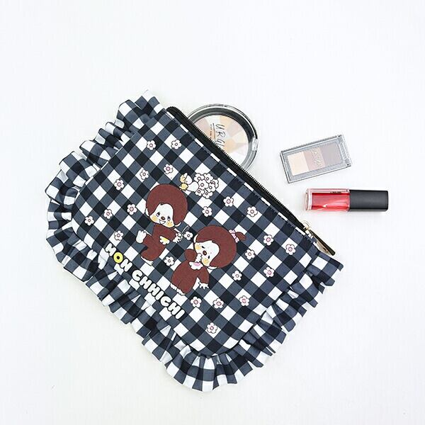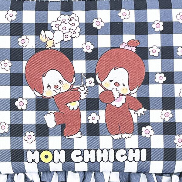 レトロなモンチッチのアートがかわいいギンガムチェックフリルシリーズです!少し大きめのポーチは内ポケット付きで小物をスッキリと持ち歩けます◎