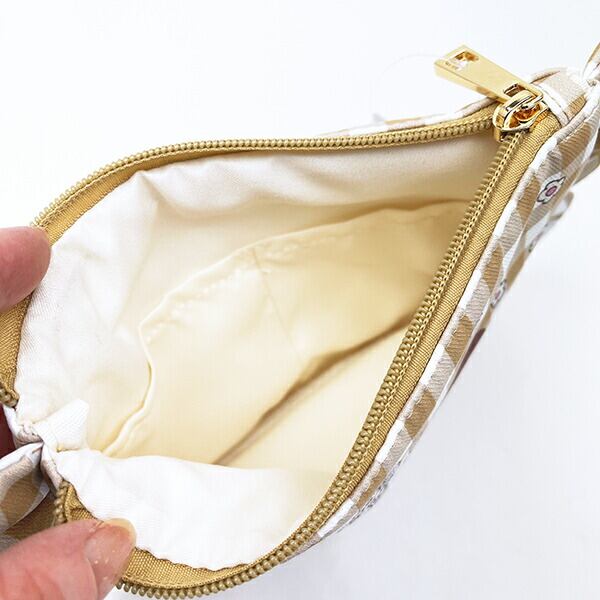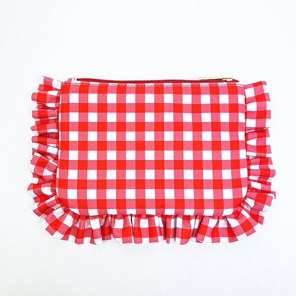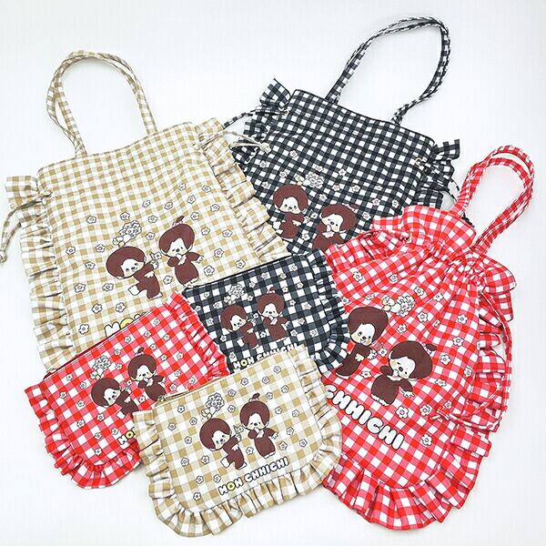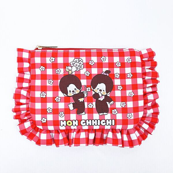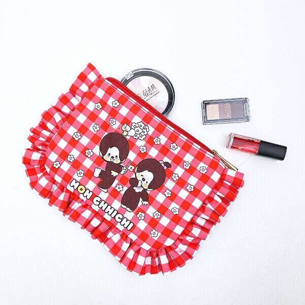 レトロなモンチッチのアートがかわいいギンガムチェックフリルシリーズです!少し大きめのポーチは内ポケット付きで小物をスッキリと持ち歩けます◎