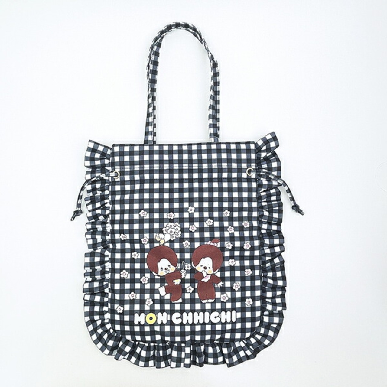 レトロなモンチッチのアートがかわいいギンガムチェックフリルシリーズのトートバッグは開口部をキュッと絞れば巾着トートに♪A4サイズの書類や雑誌、ノートまでたっぷり入ります◎