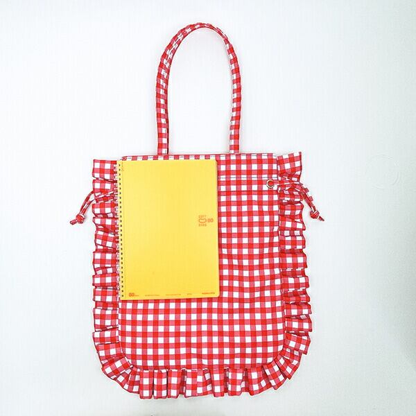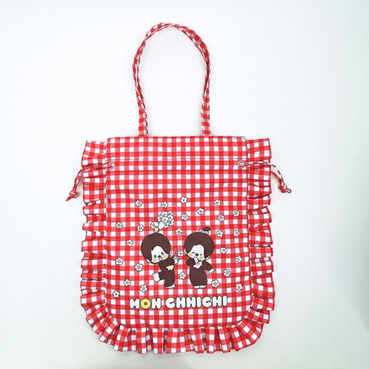 レトロなモンチッチのアートがかわいいギンガムチェックフリルシリーズのトートバッグは開口部をキュッと絞れば巾着トートに♪A4サイズの書類や雑誌、ノートまでたっぷり入ります◎