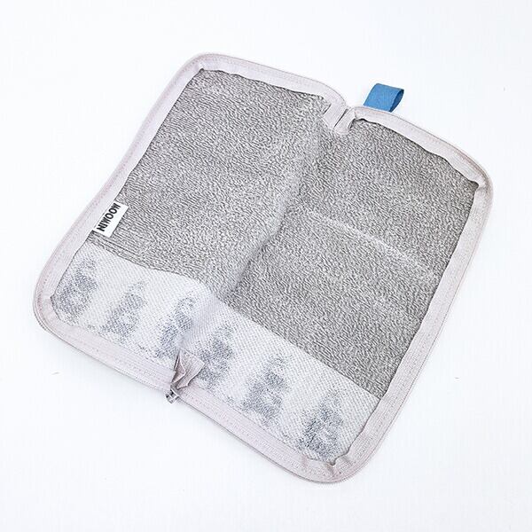 タオルのふりをしたポーチ☆キープスタンドは内側が保冷・保温にすぐれたアルミシート付きなので、ペットボトルや缶飲料を入れるのにぴったりです。タオル生地なので汚れてもかんたんに洗えるのがうれしいポイントです!大人っぽいグレーカラー♪