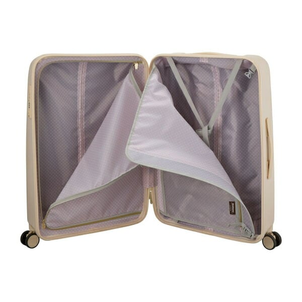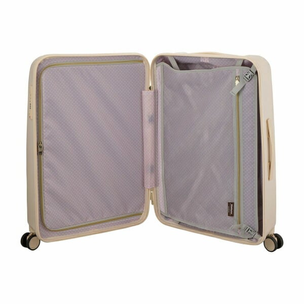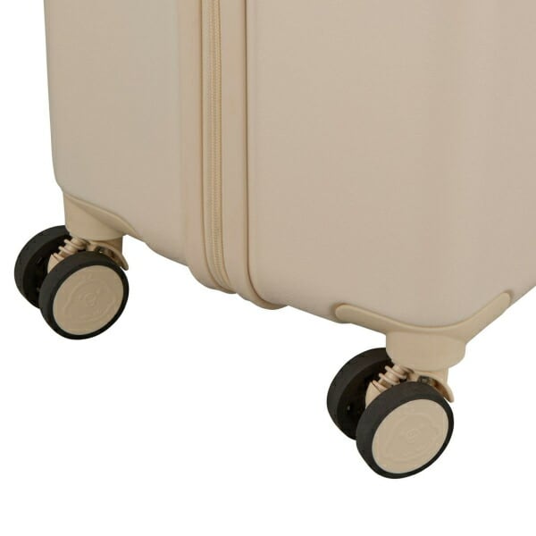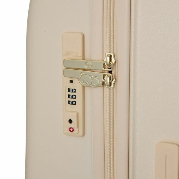 リラックマやコリラックマの顔が大きくデザインされたスーツケース。背面にはしっぽが描かれています。スーツケースのロック部分のファスナートップにはリラックマとキイロイトリがデザインされており、ロックを開けてスーツケースを開くと、内装はピンクの水玉デザインです。内装のファスナートップはリラックマの後ろ姿の形。キャスター部分にもキイロイトリがデザインされ、細部までリラックマデザインにこだわっています。キャスターは『ダブルキャスター』なので凹凸の多い路面でも安定した走行が可能。更に衝撃吸収『サスペンションキャスター』なので振動が手に伝わりにくく疲れにくい。ロックはシフレロックシステム(シフレ独自開発の2way式ロックシステム。カギでも番号でもどちらでも開閉が可能)を採用。さらに、アメリカ方面への旅行時、鍵をかけたまま航空会社に荷物を預けることが可能なTSロックも搭載。内装フタ側の間仕切りはファスナーで閉じられるので、開閉時に荷物がこぼれず便利。胴側はバックル留めの間仕切りとクロスベルト仕様なのでお荷物の荷崩れを防止することができます。【内寸:H66×W45×D28cm】【重量:約4.4kg】【容量:約81L】【宿泊目安:約7泊】【ロック:シフレロック(2wayダイヤルロック&キーロック)、TSロック】