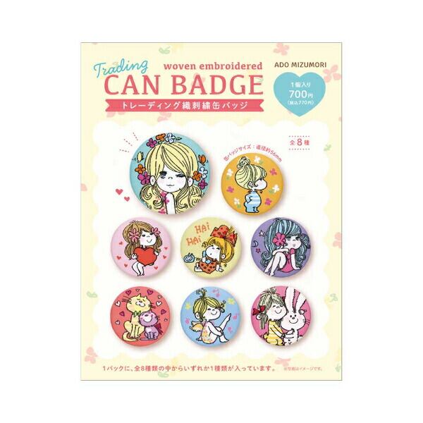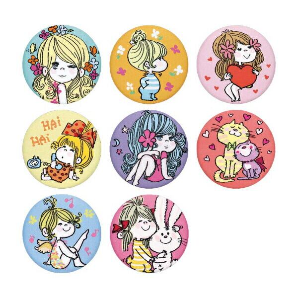 水森亜土のトレーディング織刺繍缶バッジです。パステルカラーテイストの可愛いデザインで存在感抜群☆バッグのアクセントにもなっちゃいます♪開けるまでどんなデザインが届くかわからないのでドキドキ&ワクワクが楽しめちゃいます☆彡全8種類の中からランダムアソートによりいずれか1種類が入ってます。(セット販売ではありません。)