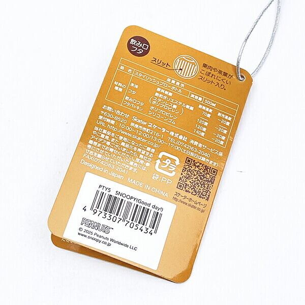 スヌーピーのスタイリッシュブローボトルです。フタを開けてすぐ飲めるダイレクトタイプ。水漏れしにくいネジ式フタ。中身が見えるクリアボディ。飲み口フタにスリットが入っているので、本体にフルーツや野菜を入れてフレーバーウォーターも楽しめます♪スヌーピーのランチアイテムなどと揃えれば、ランチタイムも楽しくなっちゃいそうです☆彡【容量:500ml】