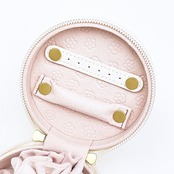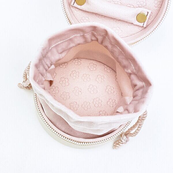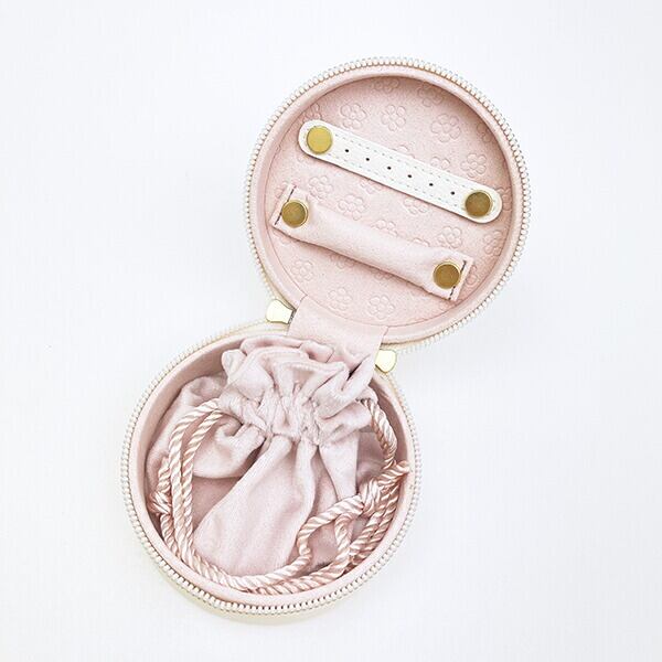 お気に入りのジュエリーをすっきりと見やすく、きれいに収納して持ち歩けるジュエリーボックスです。落ち着いた色合いと手に馴染むマットな質感の生地◎収納するジュエリーを引き立ててます。ちょっとした旅行やお出かけやお泊りにピッタリ◎天面と底面にワンポイント箔押し入り◎内生地には本体カラーにより異なるモチーフの型押し入り◎ネックレスやバングル、ヘアアクセサリーなども収納できる巾着一体型☆ファスナー引手にフェイス刻印入り◎自宅でも旅行先でもミッフィーと一緒にお洒落を楽しむことができます♪