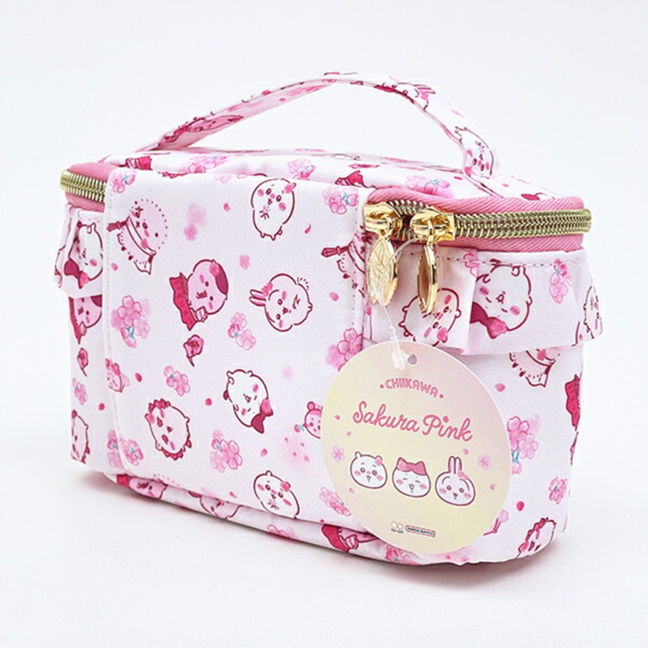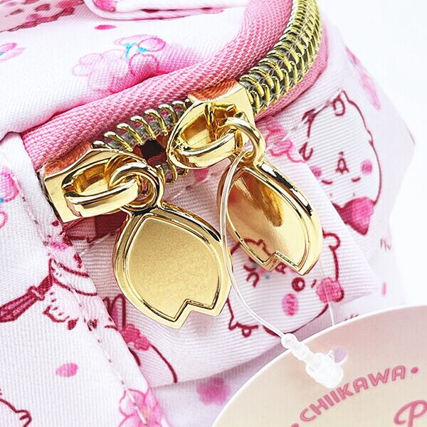 春にぴったりなちいかわの可愛いシリーズ☆フリルがかわいいバニティポーチです。ツヤのあるサテン調生地がgood♪引手は桜の花びら型になっていてとってもキュート♪メイク用品の収納にぴったり!内側ポケット付きが嬉しい〜☆サクラの妖精の古本屋によってみんなサクラ色になっちゃいました!!ぜひ可愛い同シリーズのアイテムでお好きなアイテムを見つけてみてください☆彡