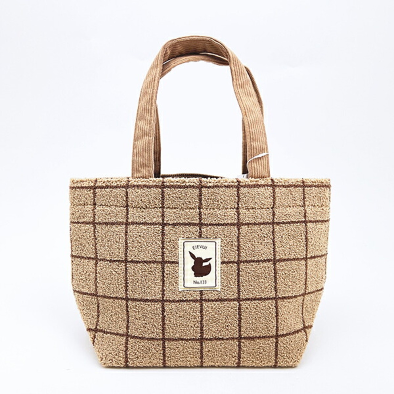 くすみカラーの「もこもこなサガラ」と「コーデュロイ」素材がオシャレなイーブイのミニトートバックです。シンプルなデザインがgood☆ランチバックとしてはもちろん、ちょっとしたお買い物バックとしても使えるサイズ感です♪