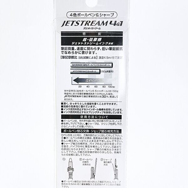 筆記荷重、速度に関わらず、低い筆記抵抗でなめらかに、ストレスフリーでスピーディーな書き味が得られます。4色ボールペン+シャープペンです。