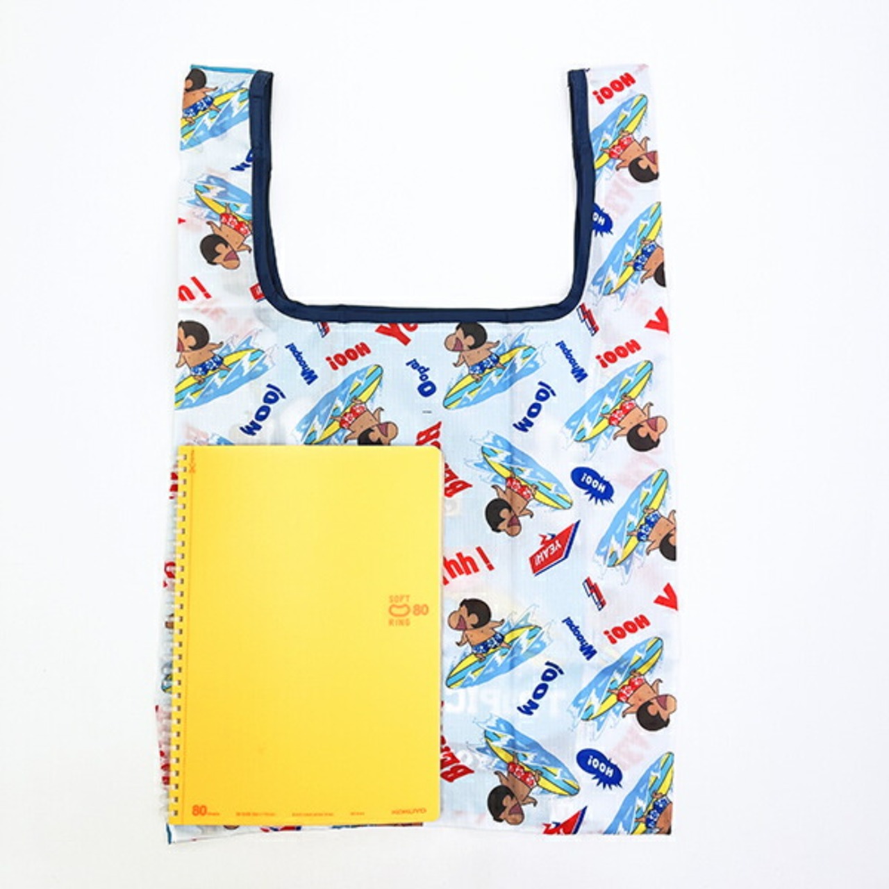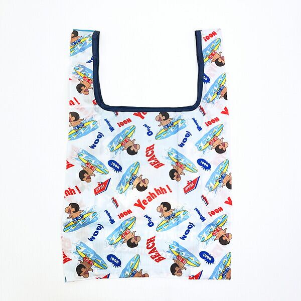 日焼けしたしんちゃんがカワイイデザインのエコバッグです。普段のお買い物に使いやすいサイズ♪折り畳めるので持ち運びも便利です。