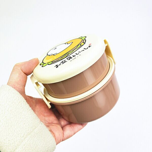 お文具といっしょの小さな丸型のシンプル2段お弁当箱です。小さな丸型のシンプル2段お弁当箱なのでコンビニの丸型おにぎり1個が袋のまますっぽり入ります♪上段下段とも、ごはんがつきにくい「くっつかない加工」。内蓋収納フォーク(プラスチック製)付きが嬉しいポイント!食べ終われば1段にコンパクトに収納できちゃうので、持ち帰りも楽々♪お文具さんのランチアイテムなどと揃えれば、ランチタイムも楽しくなっちゃいそうです☆彡フタ・シールフタ・フォークを外して電子レンジ使用可◎【容量:上段230ml/下段270ml】