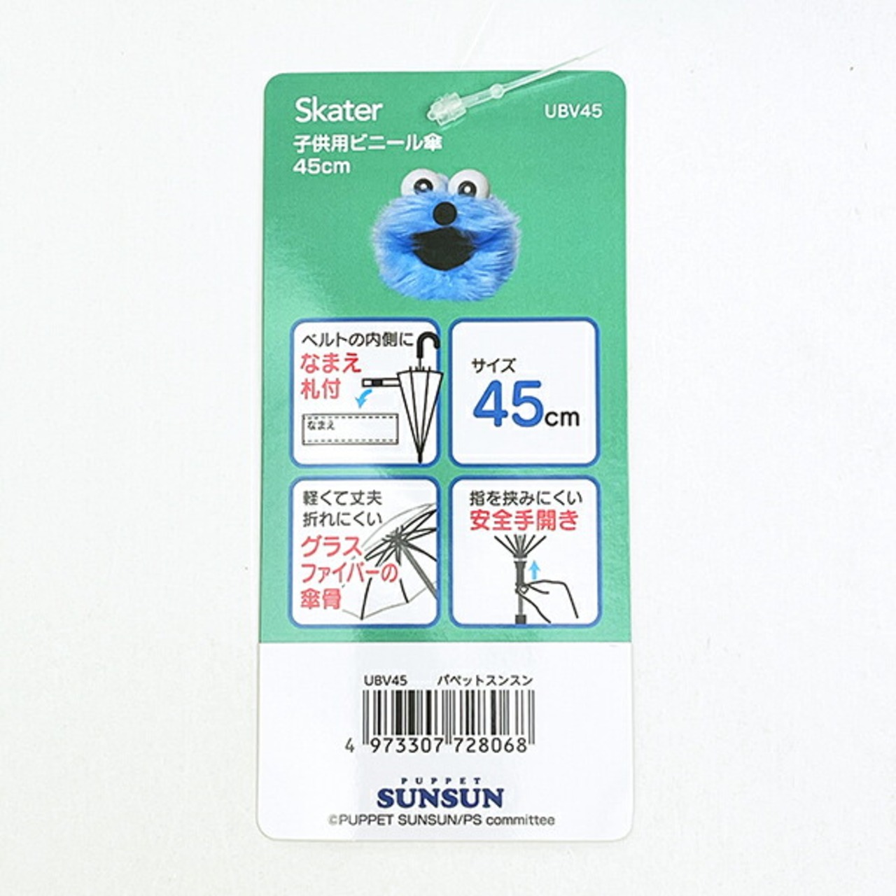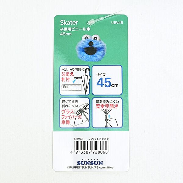 パペットスンスンのかわいいデザインの子供用ビニール長傘です。傘骨は軽くて丈夫で折れにくいグラスファイバー!開閉部は指を挟みにくい安全手開き式でお子様も安心してお使いいただけます♪ベルトの内側に名前が書けるタグが付いているのが嬉しいポイントです☆彡【サイズ】傘骨の長さ:45cm、開いた時の直径:81cm、全長:65cm