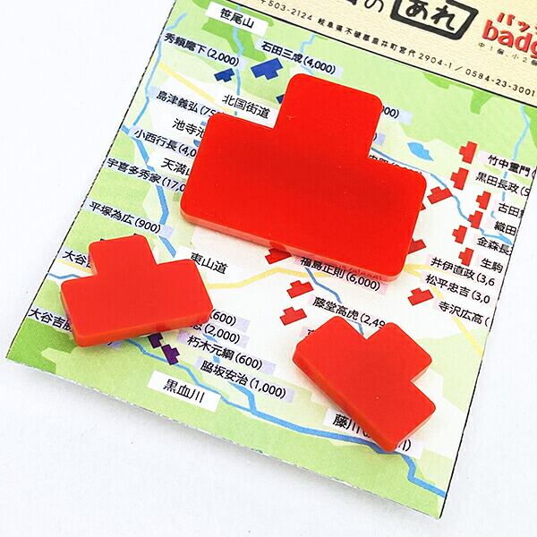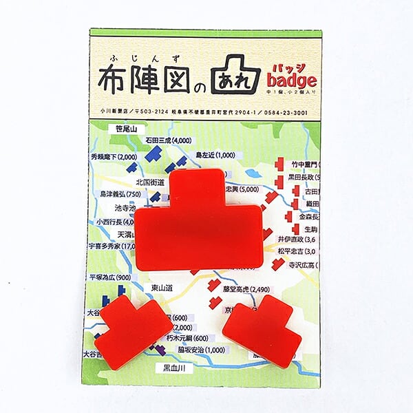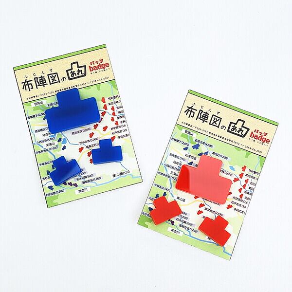 「戦況を、その身に纏う。」歴史の資料で見かけるあの「布陣図の駒」が、スタイリッシュなバッジ&ピンズになりました。鞄や帽子、ポーチを自分だけの「戦場」に見立てて、歴史への愛をさりげなく、かつ大胆にアピールできるアイテムです。商品の詳細説明大小3個セットの贅沢な陣立て: 存在感のある「バッジ(大)」が1個と、さりげなく添えられる「ピンズ(小)」が2個、合計3個がセットになっています。これ一つで、本陣と遊撃部隊のようなドラマチックな配置を楽しむことができます。選べる「陣営」カラー:赤セット: 東軍や敵陣を彷彿とさせる、情熱的で目を引くカラー。青セット: 西軍や自陣をイメージさせる、クールで知的なカラー。お好みの勢力に合わせてお選びいただけます。カスタマイズの楽しさ:別売りの「ゆる布陣図ポーチ」や「ミニトート」と組み合わせることで、布陣の臨場感はマックスに。バッグの表面をキャンバスにして、自分だけの歴史の名場面を再現できます。精密なサイズ設計:大サイズはしっかり主張し、小サイズは襟元や帽子のワンポイントに最適。ピンバッジタイプなので、取り付けも簡単です。仕様・スペック項目内容セット内容凸型バッジ(大)× 1個、凸型ピンズ(小)× 2個カラー展開赤 または 青(各セット同色入り)サイズ(大)幅35mm × 高さ27mm × 厚み3mm(金具含まず)サイズ(小)幅19mm × 高さ15mm × 厚み3mm(金具含まず)タイプ大:安全ピン型バッジ / 小:ピンズ(タックピン)おすすめの活用シーン歴史巡りのお供に: お城巡りや古戦場跡を訪れる際のリュックや帽子に。歴史好き同士の交流のきっかけにもなります。日常のアクセントに: スーツのラペル(襟)にピンズ(小)を忍ばせて、ビジネスの場での「必勝祈願」や「不屈の精神」を表現。ギフトとして: マグネットや消しゴムと組み合わせて、布陣図シリーズのコンプリートセットとして贈るのも喜ばれます。
