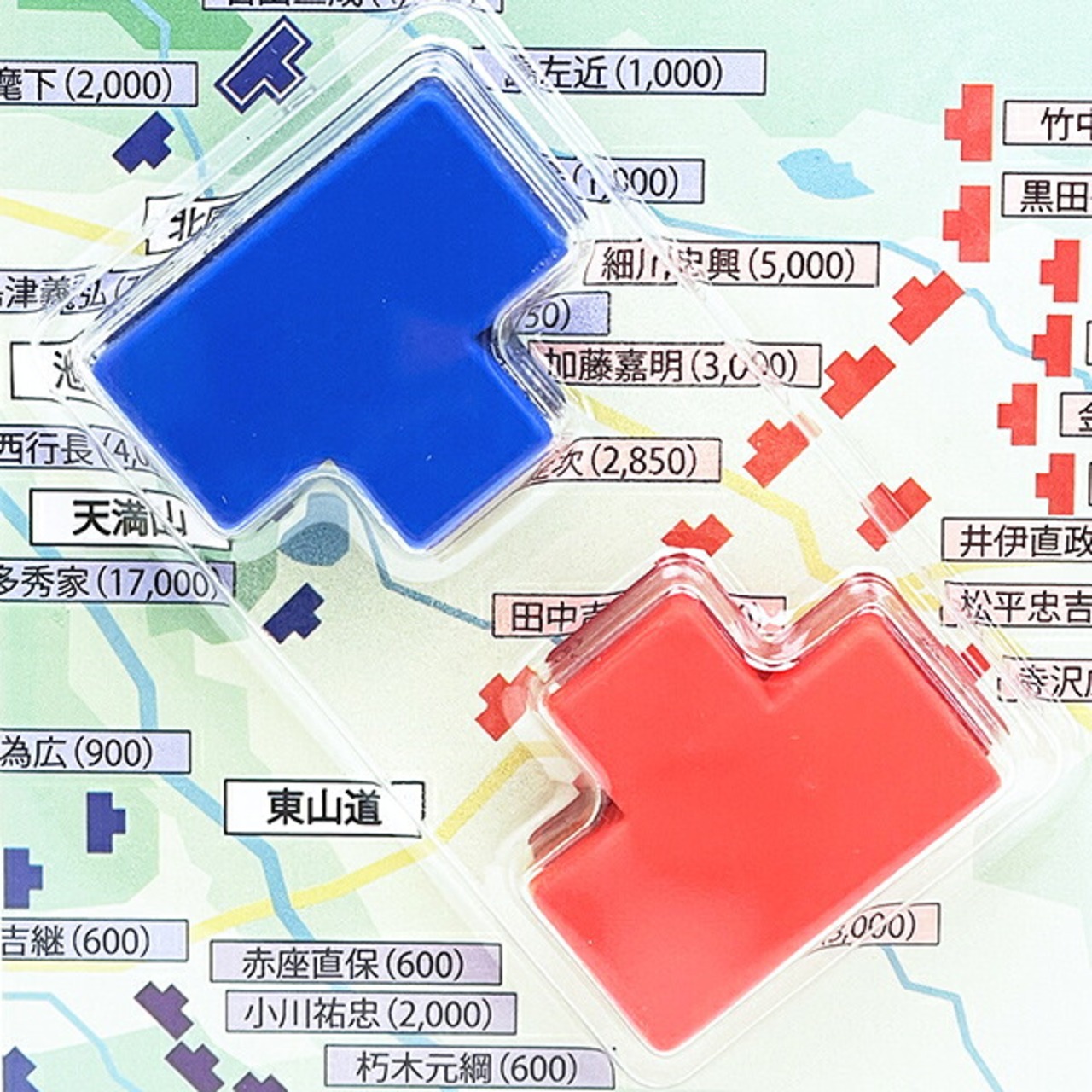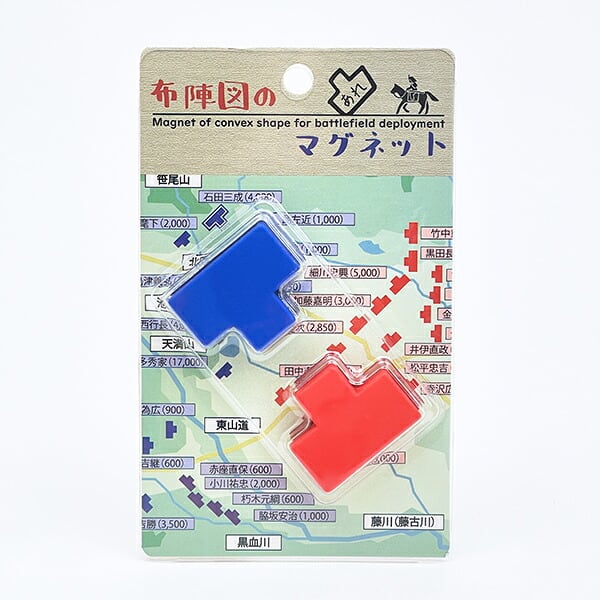 戦国時代の合戦図や、現代の歴史番組・資料で目にする「布陣を示すあの駒」が、便利なマグネットになりました。ホワイトボードや冷蔵庫の上を、瞬時に「関ケ原」や「川中島」のような戦場へと変貌させます。商品の詳細説明「あの形」を完全再現: 歴史好きなら一目でピンとくる、布陣図特有の矢印のような、あるいは家のような独特なフォルムを忠実に再現。赤(東軍・敵軍)と青(西軍・自軍)の2色がセットになっています。デスク周りで軍議(ミーティング)を:職場のホワイトボードや自宅のスチールラックなどで、タスク管理やメモ留めとしてお使いいただけます。複数セット揃えることで、より大規模な布陣を敷くことができ、日常の風景がドラマチックな合戦場に早変わりします。こだわりの質感:消しゴムの主原料(PVC)を使用しているため、硬すぎず手に馴染む柔軟性があります。表面は光沢を抑えたマット仕上げになっており、重厚で落ち着いた印象を与えます。実用的な磁力:内部にはネオジウム磁石を内蔵。強力すぎず弱すぎない「ちょうどいい磁力」で、プリントやメモをしっかりと固定しつつ、片手でスッと動かして「進軍」させることが可能です。仕様・スペック項目内容セット内容赤駒 × 1個、青駒 × 1個(計2個入)サイズ1個あたり:幅 約34mm × 奥行 約27mm × 厚み 約10mm素材PVC(ポリ塩化ビニル)、Nd-Fe-B(ネオジウム磁石)質感表面:マット仕上げ(梨地のような落ち着いた質感)裏面:ツルツルとした光沢仕上げ(両面マグネットとして使用可能)パッケージブリスターパック入り