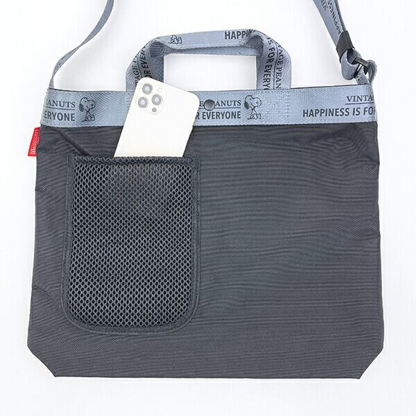 スヌーピーがドッグハウスの上でくつろぐデザインが可愛いショルダーバッグです。トートバッグ&ショルダーバッグの2way仕様!A4サイズが収納可能な「ミディアム」。口元はドットボタンでサッと開閉。ざっくりハリのあるポリエステル素材が、カジュアルスタイルにぴったり♪ショルダーベルトは長さ調節が可能なので手持ち肩掛け、斜め掛け、シーンに応じて使い分けができちゃいます☆背面のルーポケットには、スマホなど頻繁に出し入れするアイテムを入れておくと便利です♪