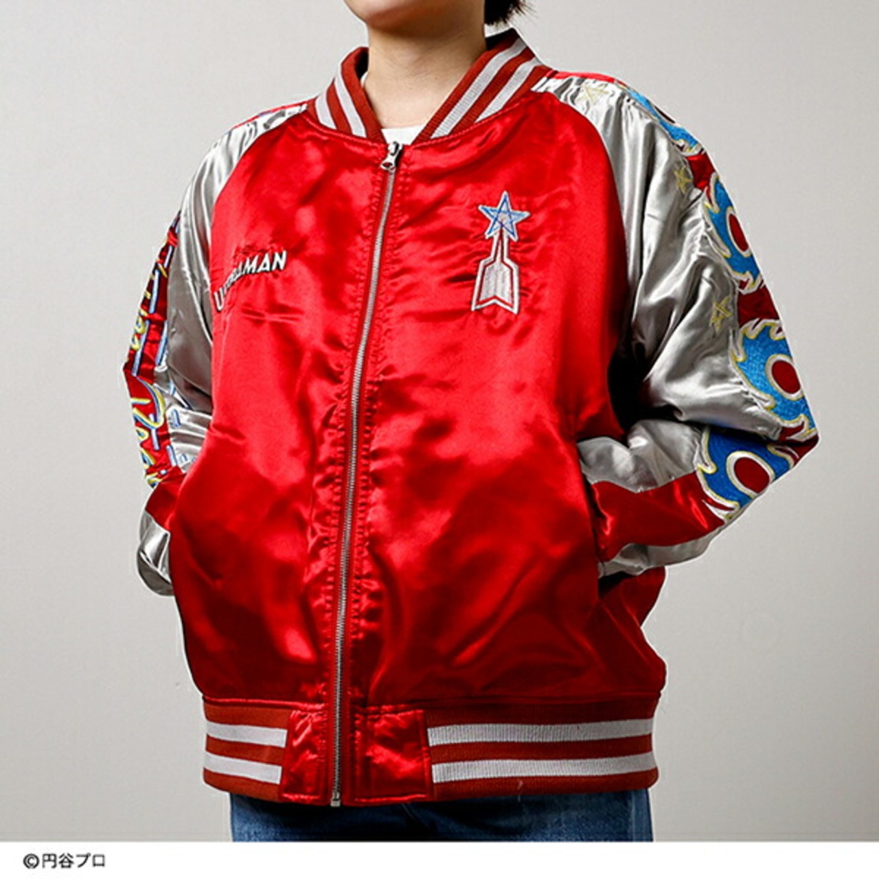 ウルトラマンが背面に刺繍されているスカジャンです。しっかりした光沢感の生地でカッコよく着られます。【サイズ】108〜116cm、身長:175〜185cm