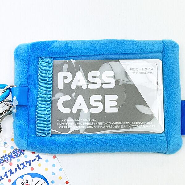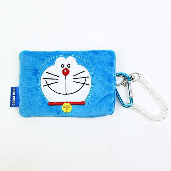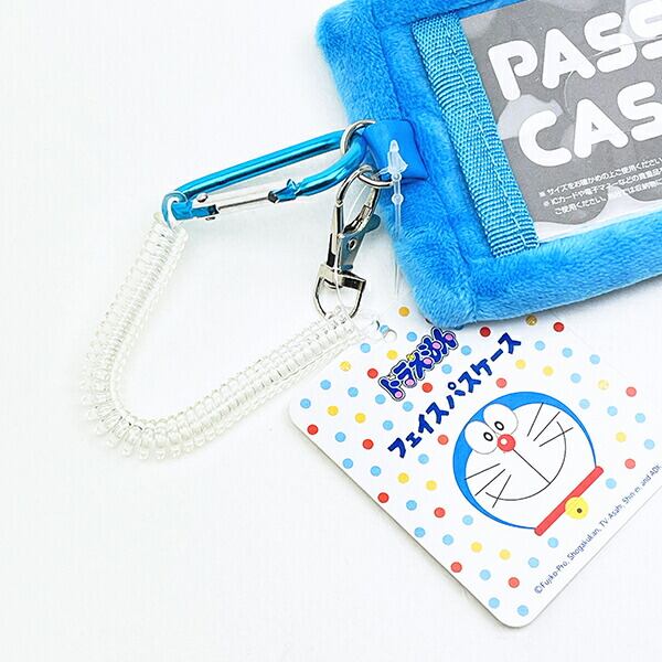 ふわふわ生地のパスケースです。表面はドラえもんのお顔でカワイイ!!カラビナとコイル付きなのでバッグに付けたままタッチできます。