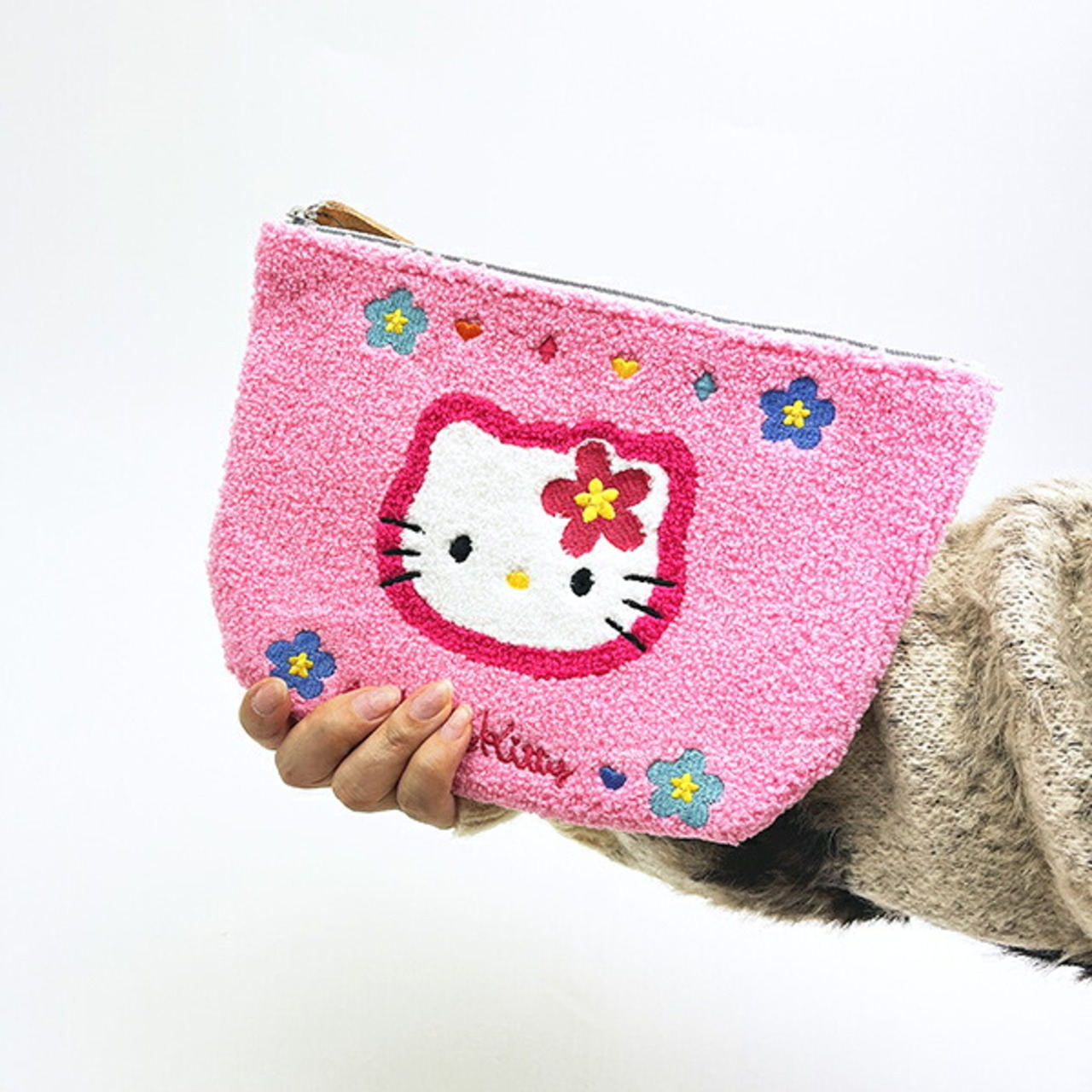 カオハナキティちゃんのサガラポーチ♪サガラ刺繍は一本の糸をかぎ状の針ですくいあげながら縫う手法。毛糸をつかったふわふわとした感触の高級な立体感のあるデザインがかわいいです♪メイク用品やお菓子、小物など入れるのにぴったりなのでバッグの中の収納に便利☆少し大きめでしっかりしているので、お子様のおむつなどを数枚入れるのにも◎バッグに入れておくだけでも可愛いのでおすすめです♪