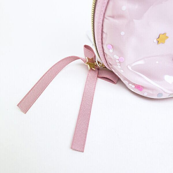 キラキラスパンコール入り☆かわいいリボンチャームもついたラウンドポーチです。コスメや小物を入れるのにぴったりなサイズ感??表面にはキラキラの星がシャカシャカ動いてすごく可愛いです♪♪ぜひ同シリーズでお気に入りのアイテムを見つけてみてください☆彡