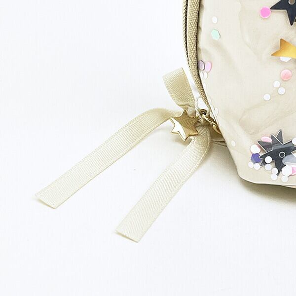 キラキラスパンコール入り☆かわいいリボンチャームもついたラウンドポーチです。コスメや小物を入れるのにぴったりなサイズ感??表面にはキラキラの星がシャカシャカ動いてすごく可愛いです♪♪ぜひ同シリーズでお気に入りのアイテムを見つけてみてください☆彡