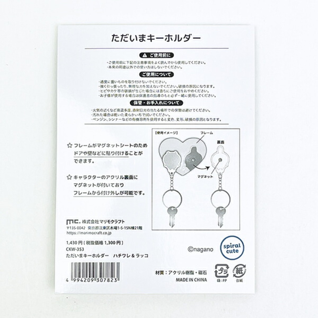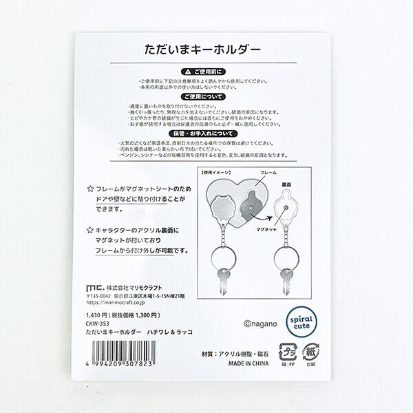 ハチワレ&ラッコのただいまキーホルダーです。フレーム裏面がマグネットシートなので、ドアや壁に貼り付けOK!お家に着いたらキーホルダーをハートのフレームに戻してただいましよう??これでカギの迷子も解決できちゃいます☆彡