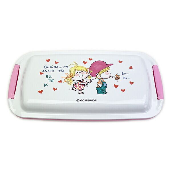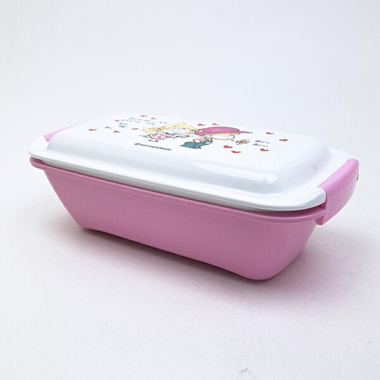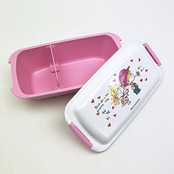 水森亜土のしっかり簡単2点ロックのお弁当箱です。ドーム型のフタで、"ふわっ"とご飯やおかずが詰められ、高めの仕切り付きでおかずが片寄りにくい◎角が丸く、横型で幅広のパッキン溝で洗いやすいです。食洗機・電子レンジ(フタを外せば)使用可◎【容量:530ml】