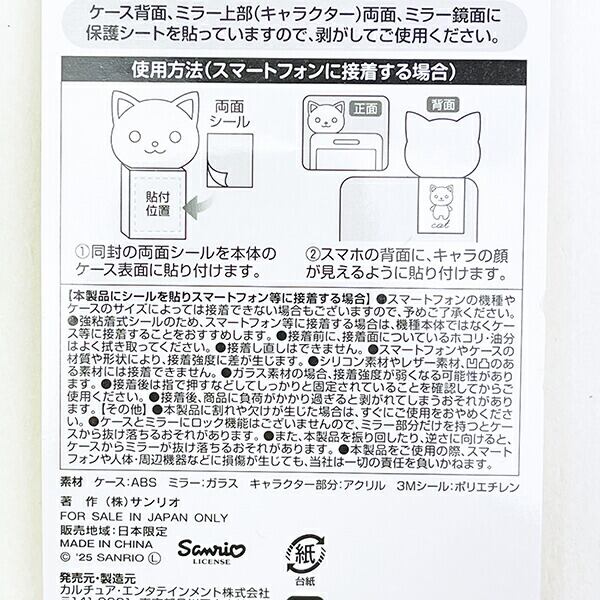 サンリオのコンパクトサイズのスティックミラーです。リップ直しや目元のチェックなど、ちょっとしたときにさっと取り出せて使える便利なアイテム◎ケースに付属の両面シールを貼ればスマホに装着できます★両面シールを貼らず、そのままでももちろんお使いいただけます★同シリーズでシナモン、クロミ、ポムポムプリン、ハローキティ、マイメロディもございますのでお好きなキャラクターと一緒に推し活を楽しんじゃおう!