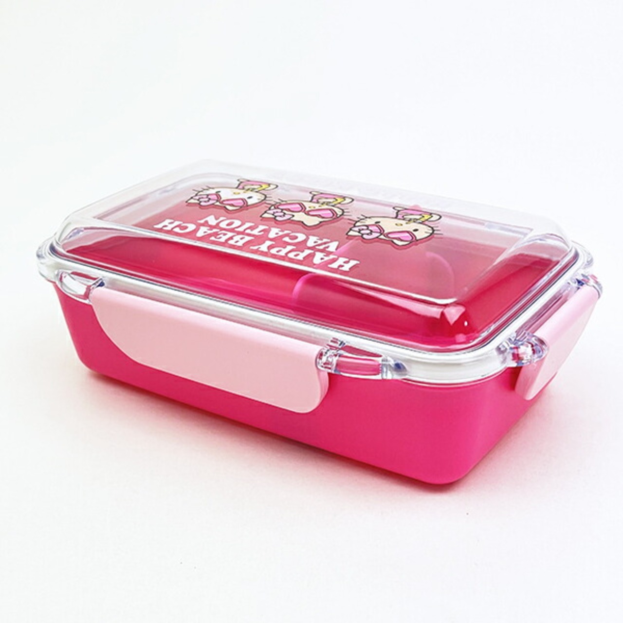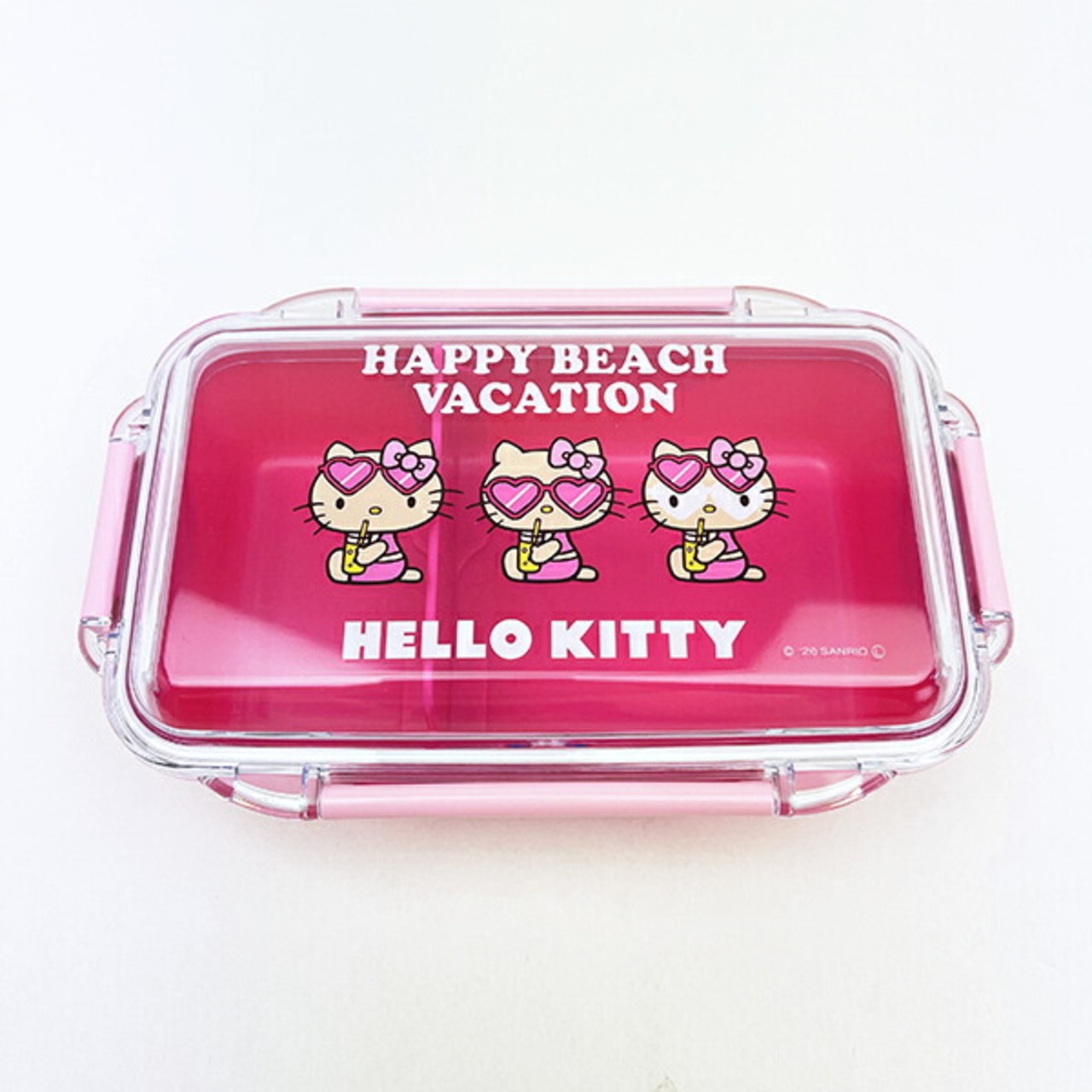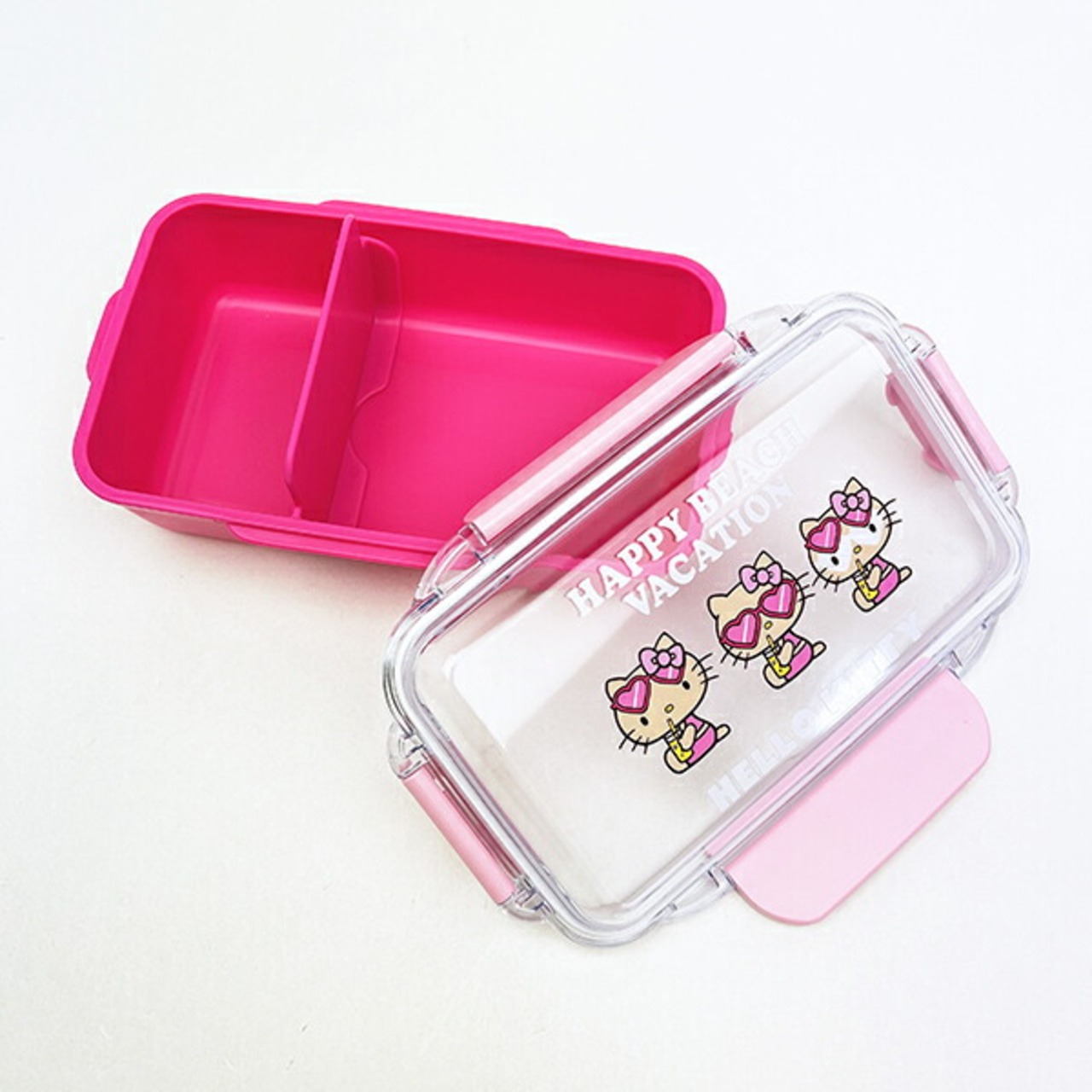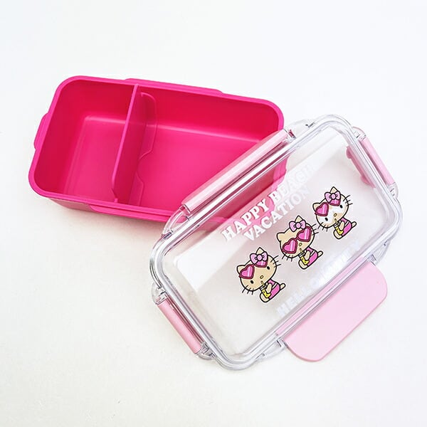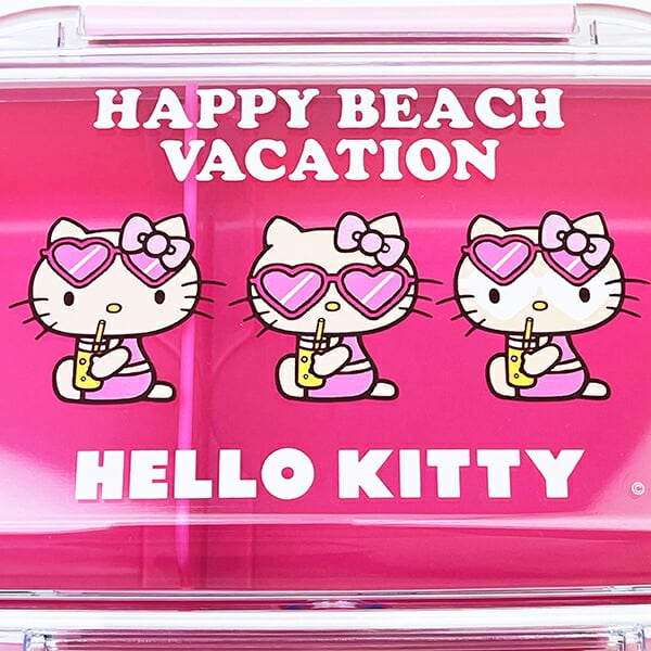 日焼けキティの4点ロックランチボックスです。フタが透明になっていて中身が見えるのでキャラ弁にもgood♪4点ロックの密封式で汁漏れしにくいです◎日焼けキティのランチアイテムで揃えればランチタイムの楽しくなること間違いなしです☆彡電子レンジ(フタをはずして)使用可◎【容量:500ml】