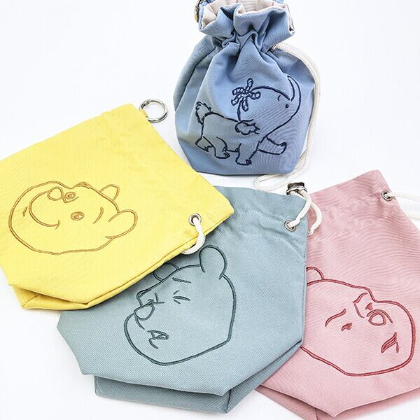 プーさんが刺繍された巾着♪イヤホンやアクセサリー、薬など小さい物を入れておくのに丁度いいサイズ♪カラビナ付きなので、バッグなどに吊るしておくこともできます♪