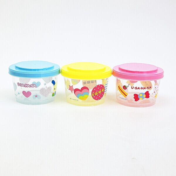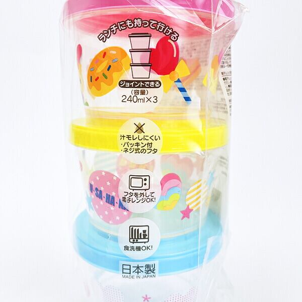 ウサハナのカチっとスタッキングができるプラスチック容器3点セットです。ご飯やおかず、デザートなどを入れて、ランチにも持って行けちゃう便利な保存容器☆余ったおかずや薬味などの保存にもぴったり◎パッキン付きで、ネジ式タイプのフタだから汁漏れしにくいのが嬉しいポイント♪ウサハナのランチアイテムなどと揃えれば、ランチタイムも楽しくなっちゃいそうです☆彡食洗機・フタを外して電子レンジ使用可◎【容量:240ml×3個】