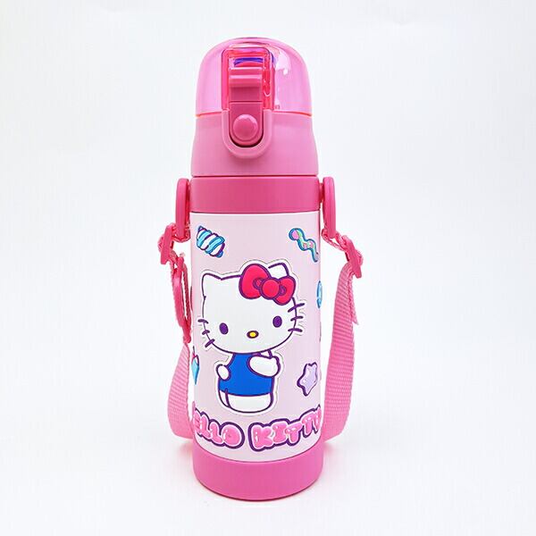 ハローキティの3Dロック付ワンプッシュダイレクトボトルです。ワンプッシュオープンで飲みたい時に"サッ"と飲める♪ネームプレート付きのショルダーベルトがついているので小さいお子様用にも◎真空二層構造なので、保冷効果が長持ちして嬉しい♪立体プリントが可愛すぎるので小さいお子様も喜ぶこと間違いなしです☆彡【容量:480ml】