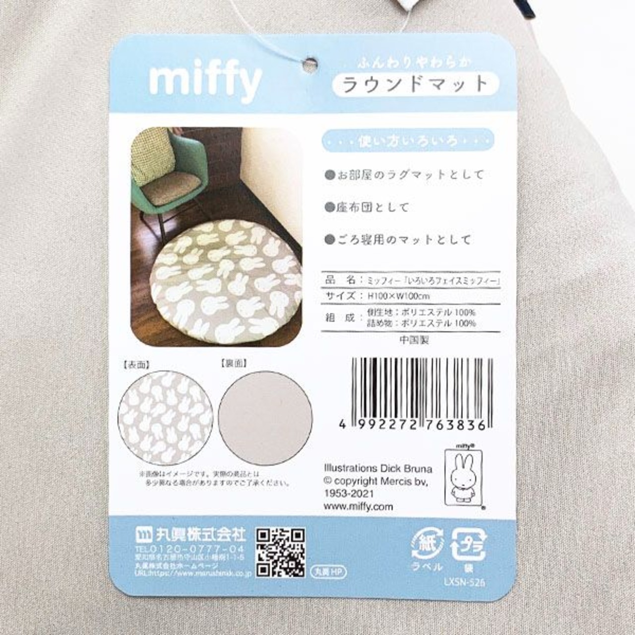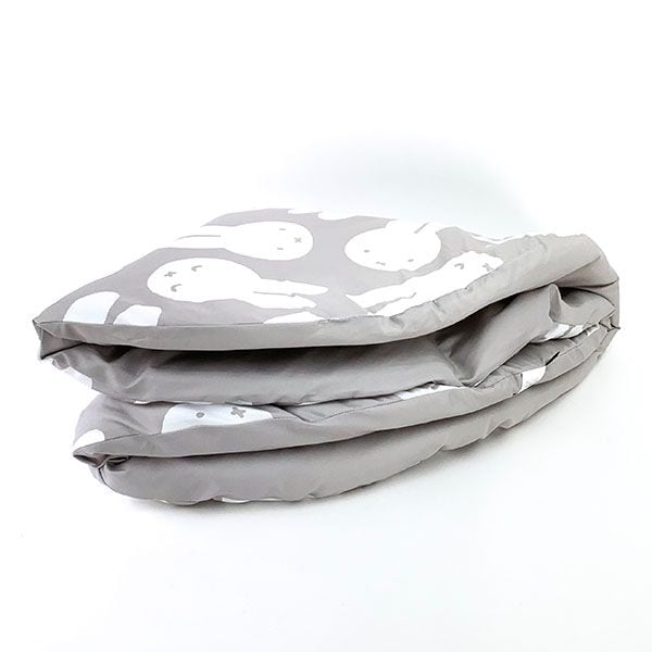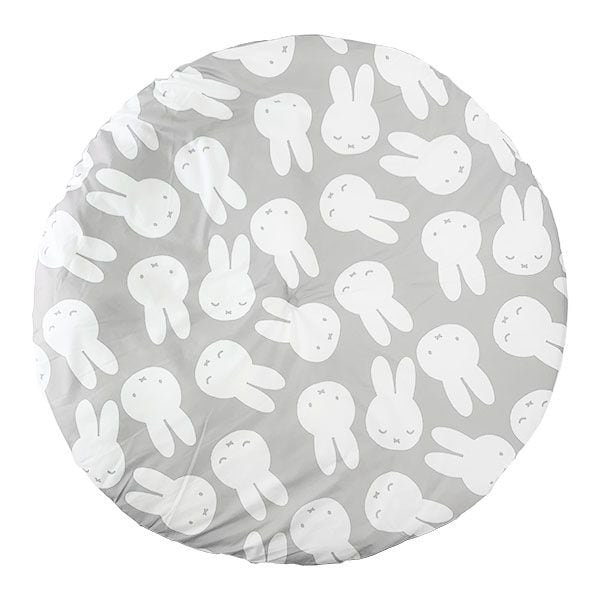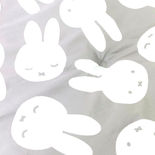 直径1mのラウンド型クッションです。とっても大きいので、座るだけでなく寝転がったりしてくつろげます♪いろんな表情のミッフィーのお顔のチラシ柄で、メインカラーはグレーとインテリアの邪魔にならないデザインです。