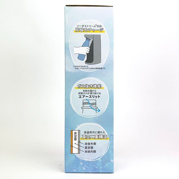 炭酸飲料を入れることができる保温保冷ステンレスまほうびん。容量は530mlで飲み口が細くなっているため、飲みやすい形状。また、家庭用炭酸水製造機にセットして炭酸をステンレスボトルに直接注入することができます。炭酸水製造機使用時は380ml容量をお守りいただくため、分かりやすいようステンレスボトル内瓶に給水ラインもございます。。