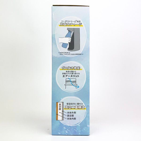 炭酸飲料を入れることができる保温保冷ステンレスまほうびん。容量は530mlで飲み口が細くなっているため、飲みやすい形状。また、家庭用炭酸水製造機にセットして炭酸をステンレスボトルに直接注入することができます。炭酸水製造機使用時は380ml容量をお守りいただくため、分かりやすいようステンレスボトル内瓶に給水ラインもございます。。