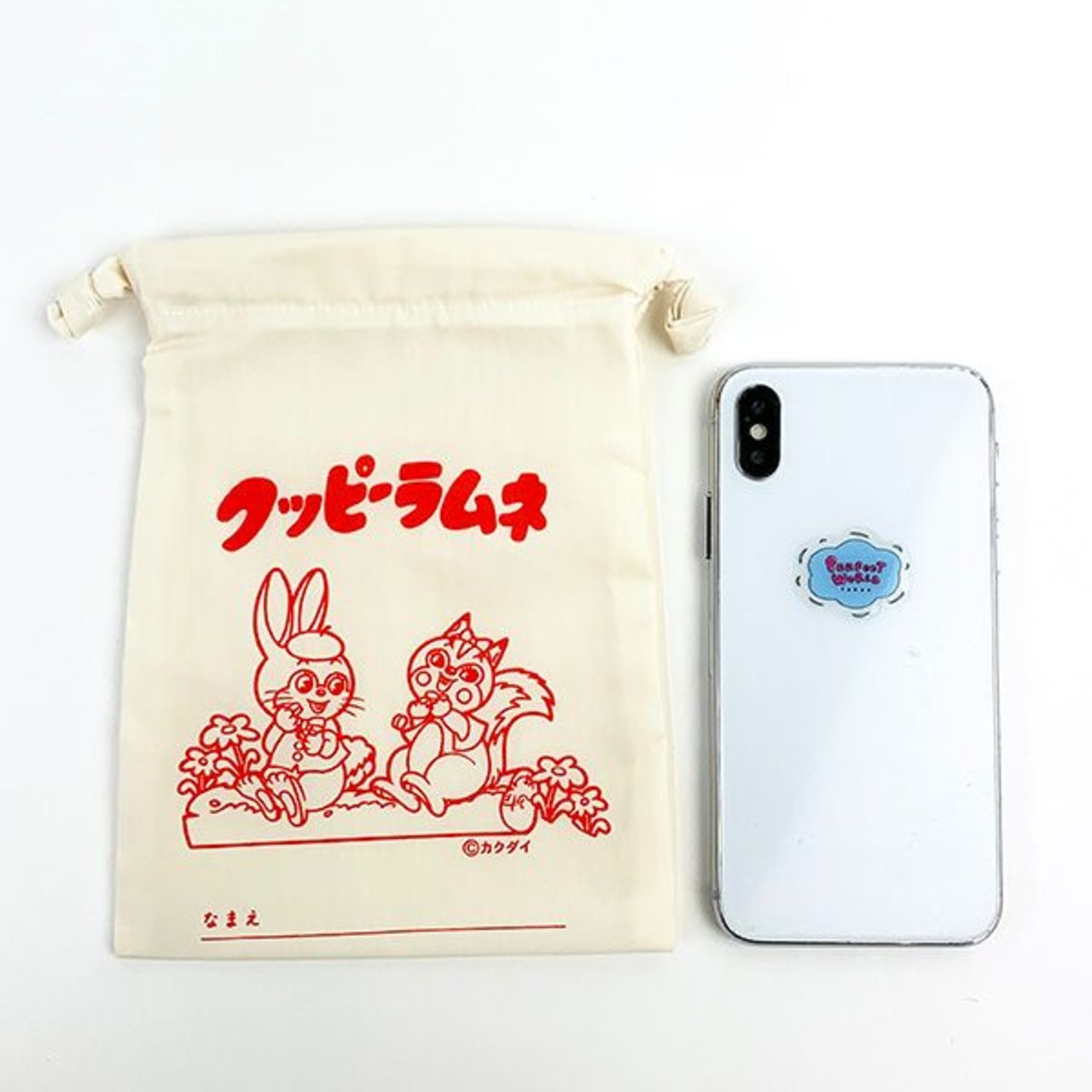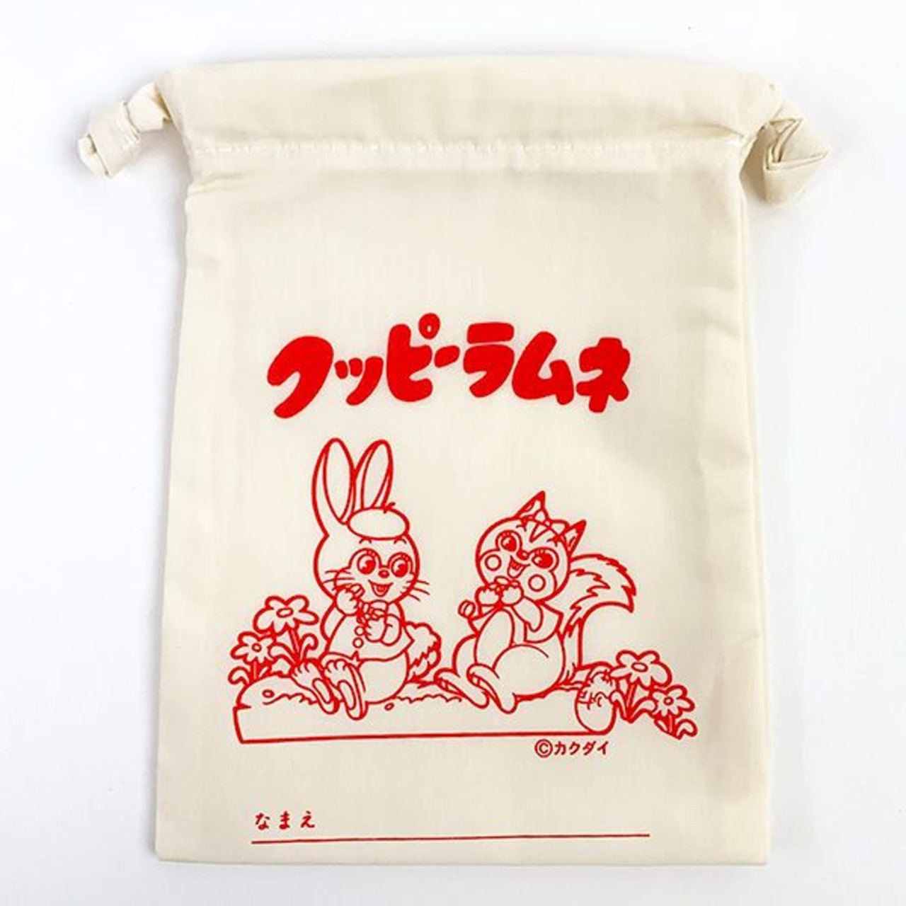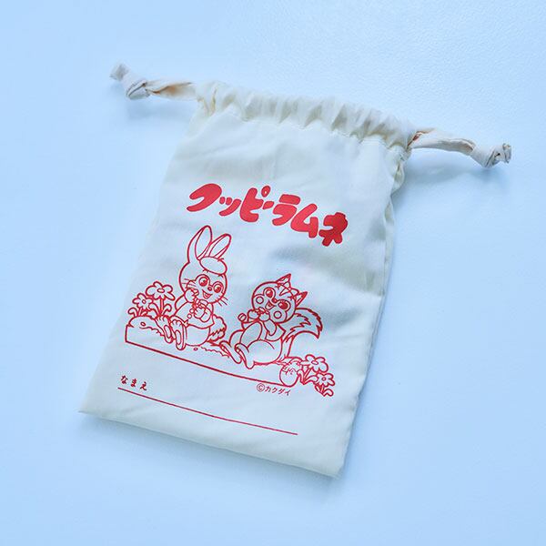 世代を越えて愛され続けるロングセラーの駄菓子「クッピー ラムネ」の巾着です。レトロデザインが大人可愛い!ほどよく収まる小さめなサイズ感の巾着袋。