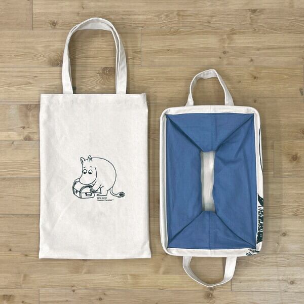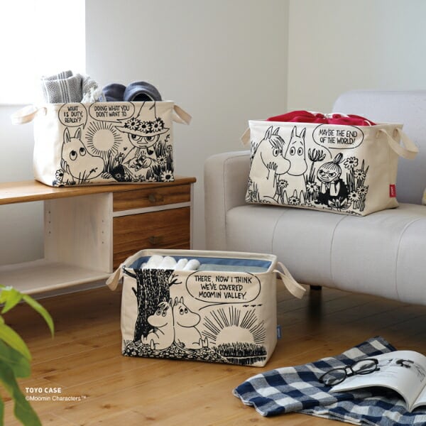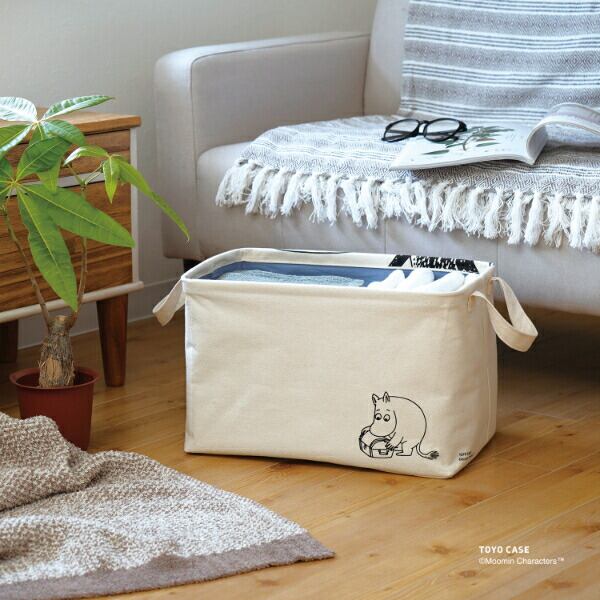 使い勝手の良いサイズ感の「スクエアバスケット」をナチュラルな素材とムーミンのアートでオシャレに仕立てました。本体には、テクスチャ感のあるコットン100%の生地を使用しています。シャツが約12枚収納できるサイズです。