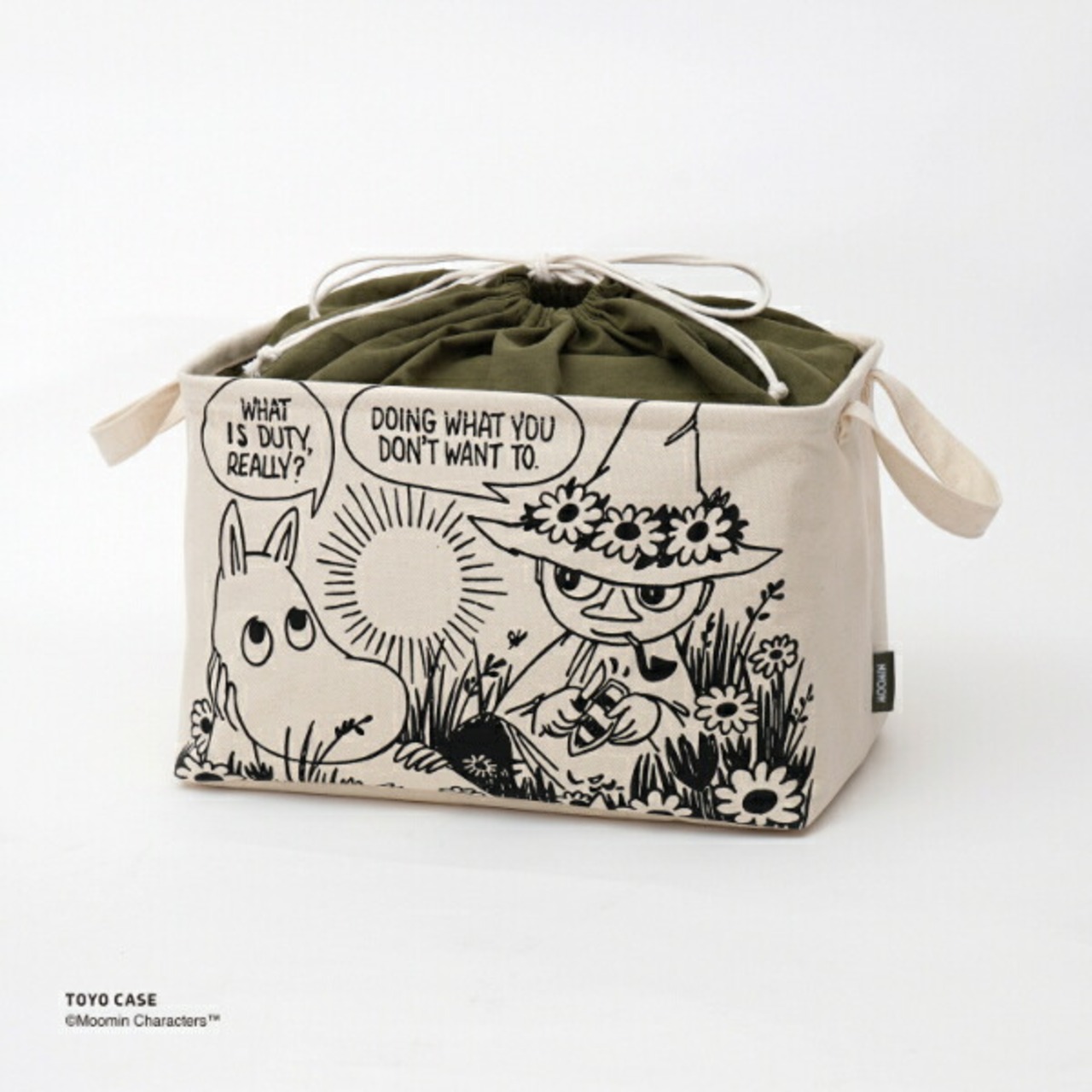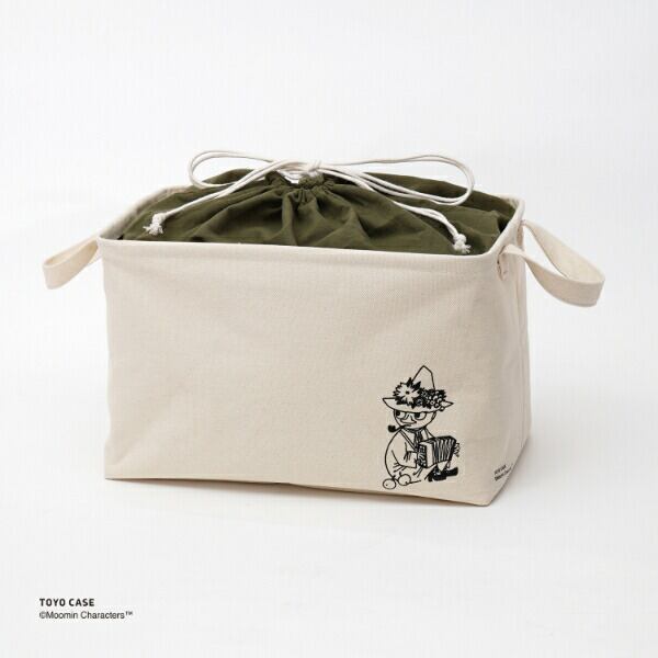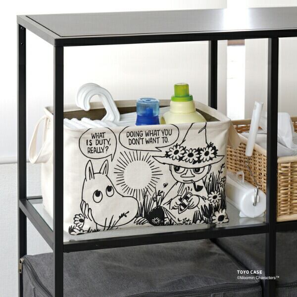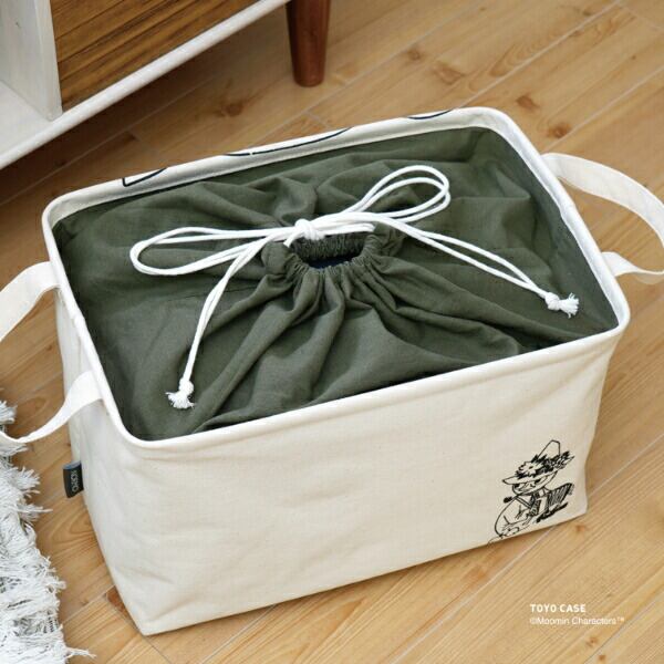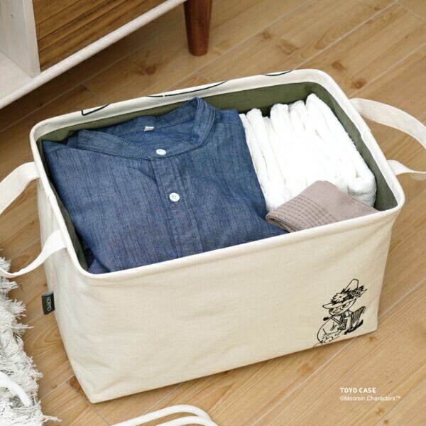 使い勝手の良いサイズ感の「スクエアバスケット」をナチュラルな素材とムーミンのアートでオシャレに仕立てました。本体には、テクスチャ感のあるコットン100%の生地を使用しています。シャツが約12枚収納できるサイズです。