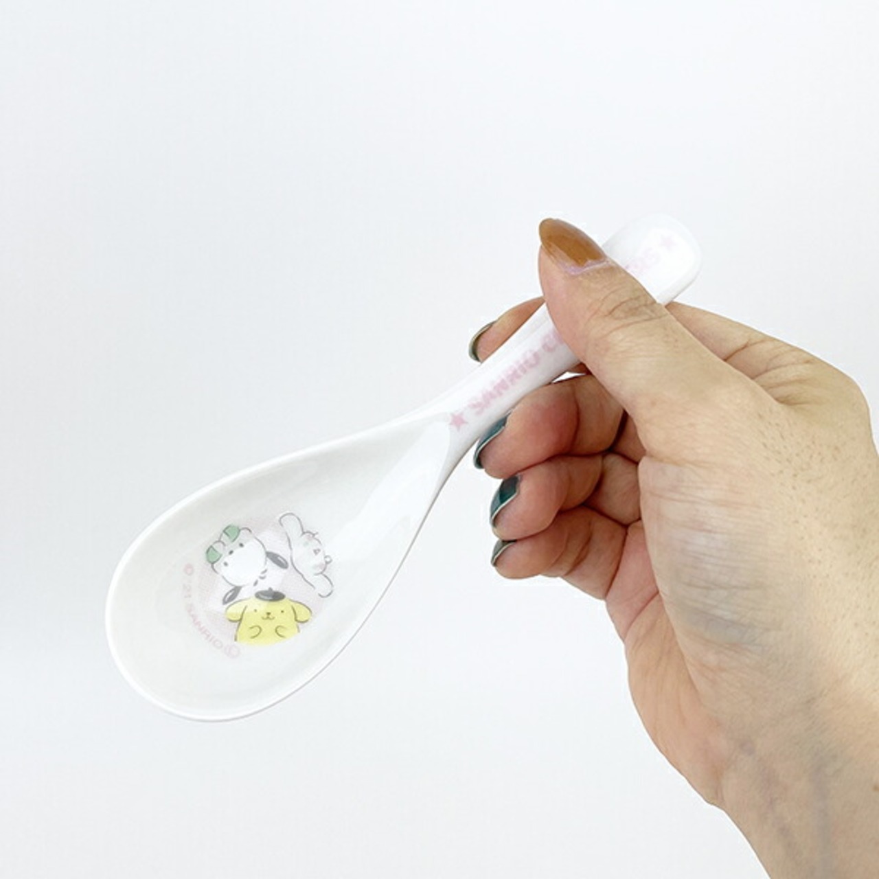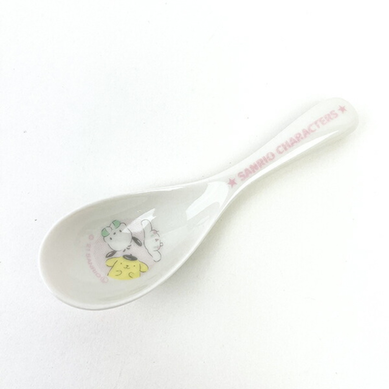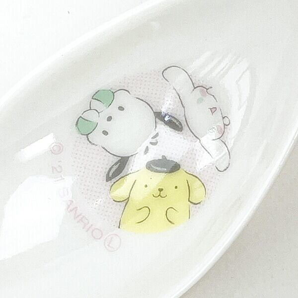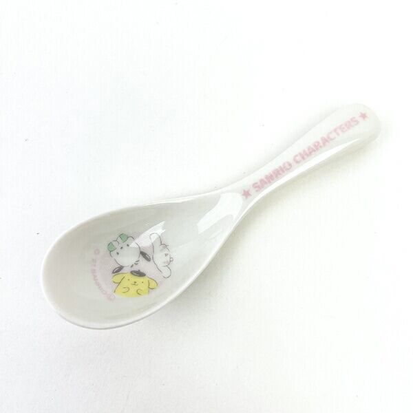 サンリオキャラクター大賞2021のTOP3のポチャッコ、ポムポムプリン、シナモンが楽しく遊んでいるデザインのレンゲです。かわいいサンリオキャラクターズと一緒にお食事時間を楽しんで♪食洗機・電子レンジ使用可◎【長さ:14cm】
