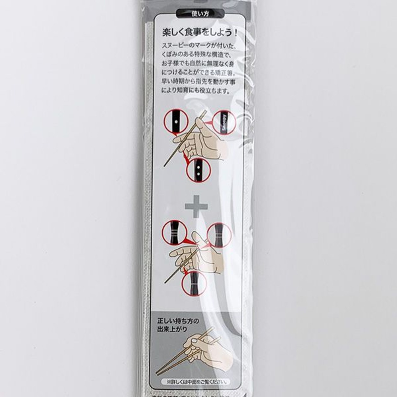 スヌーピーシルエットを自分に向けるだけで簡単上手に持てます。くぼみのあり特殊な構造で、無理なく美しい持ち方ができます。お子様から大人の方まで対応できる3サイズを取り揃えました。