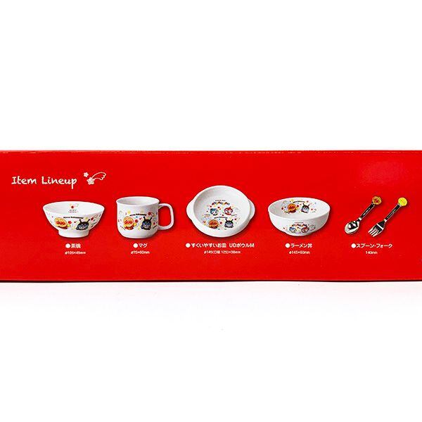 アンパンマンと仲間たちのかわいい食器セットが出来ました。コキンちゃんも加えたなかよしシリーズです。お茶碗、マグ、すくいやすいお皿、ラーメン丼、スプーン、フォークがセットになっています!かわいい箱入りなので、ギフトにもピッタリ♪◆器類は電子レンジ、食洗器の使用が可能です。◆サイズ:(茶碗)約10.5φ×4.5cm・(マグ)約7.5φ×6cm・(すくい易い食器UDボウルM)約14.5φ×3,8cm・(ラーメン丼)約14.5φ×6cm・(スプーン・フォーク)約13.5cm