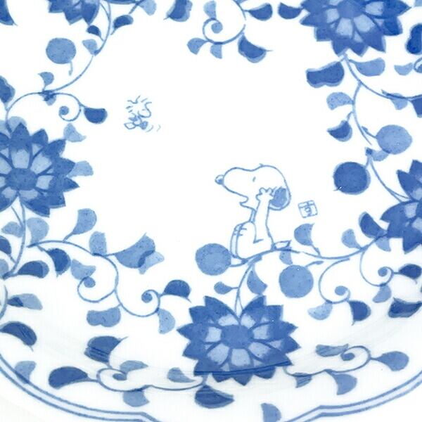 藍唐草とスヌーピーの五寸皿です。伝統的な唐草のスヌーピーデザイン。大人が毎日使いたくなるモダンでお洒落な和食器です。スヌーピ好きや、海外の人へのプレゼントにも喜ばれますね♪本商品は「染付製法」による食器です。商品によって釉薬、色の濃淡がございます。予めご了承ください。電子レンジ・食洗器使用可◎