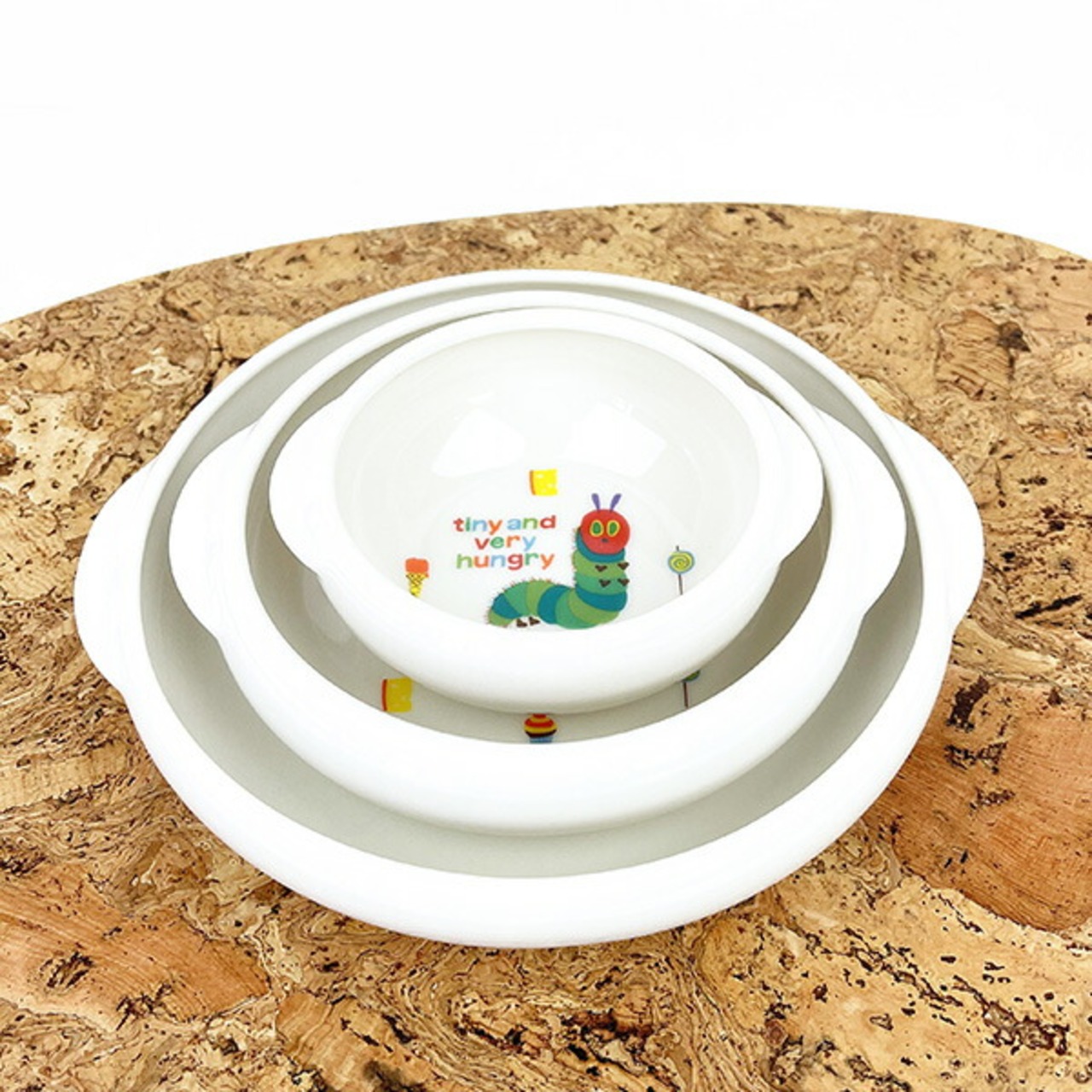 はらぺこあおむしすくいやすい食器!お子様にもママにも優しい機能食器です。ボウルが内側に反っているので、スプーンですくいあげた食べ物が外にこぼれるのを防ぎ最後の一口まで綺麗にすくえる。持ちやすい取っ手付きや積み重ね収納もできます◎S・M・Lの3サイズ展開なので揃えてもGOOD♪