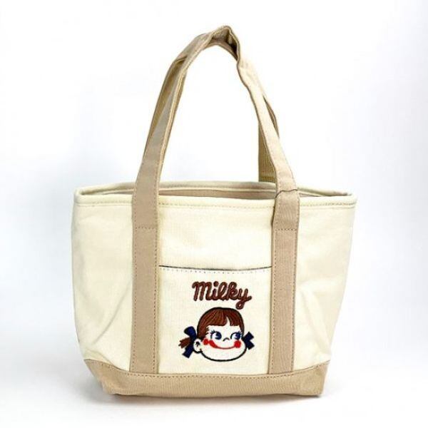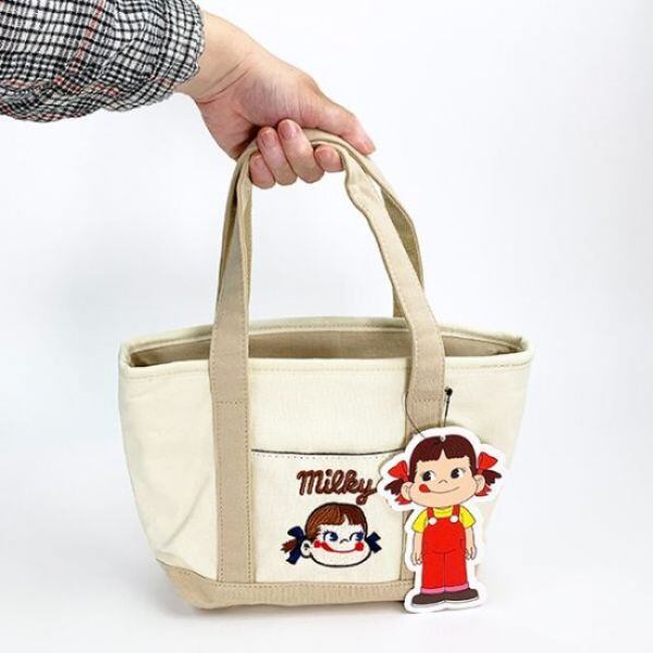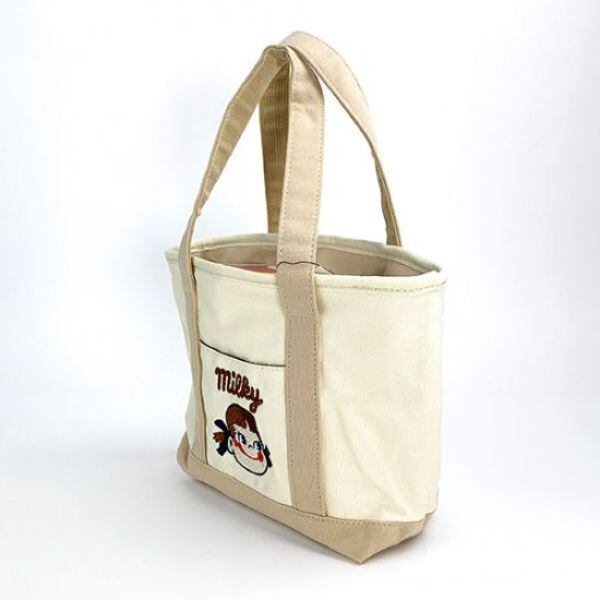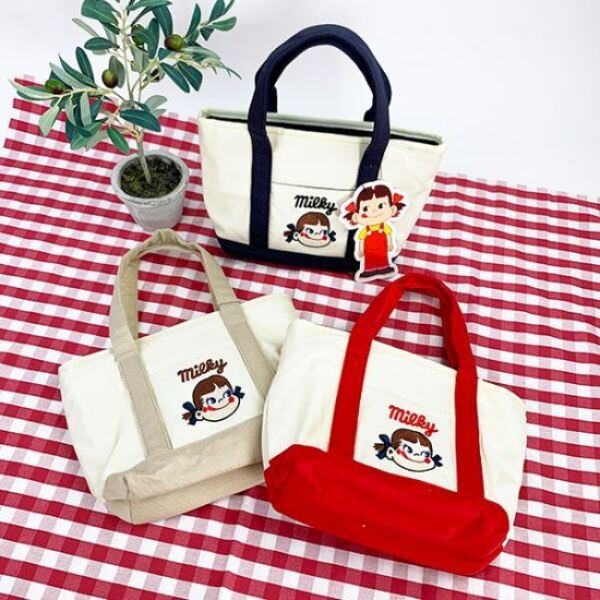 ペコちゃんのミニトートが登場!ネイビー、レッド、ベージュの三色展開。マチが12cmあるので沢山入ります!ペコちゃんの刺繍が施されています。