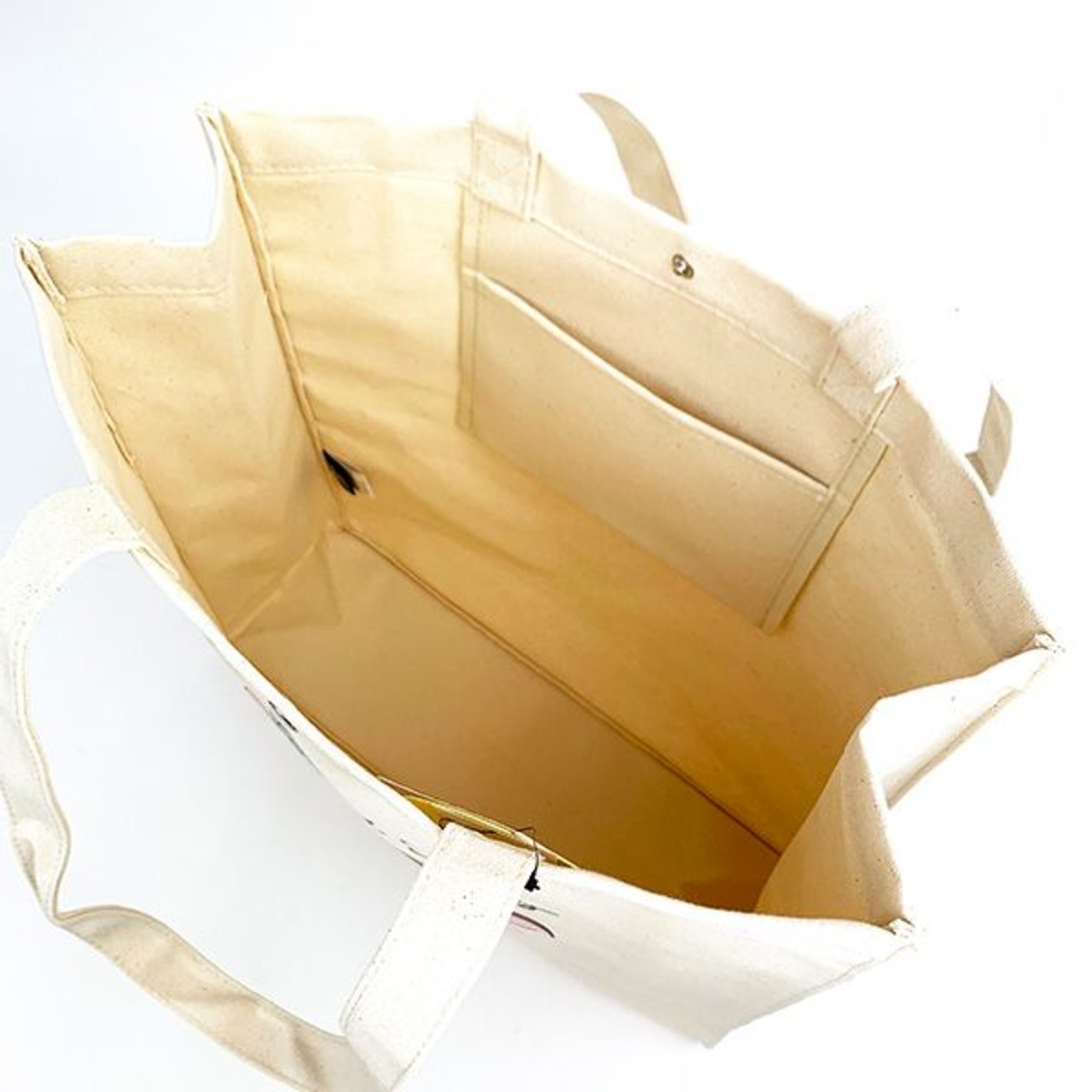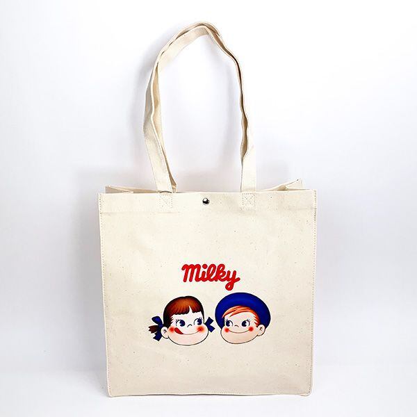 ペコちゃんとポコちゃんのイラストがかわいいトートバッグ。丈夫なキャンバス生地で、内側に小さなポケットとスナップもついているので、使い勝手もバツグンです◎◆サイズ:39cm×38cm×12cm