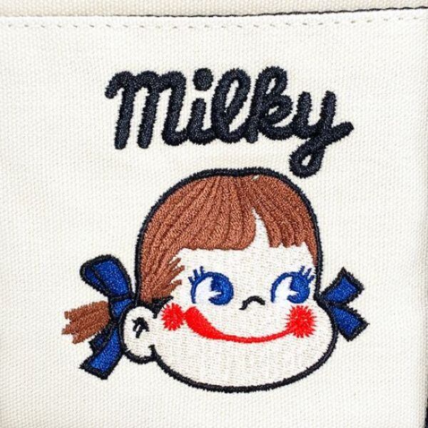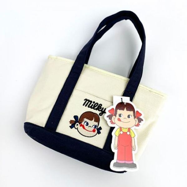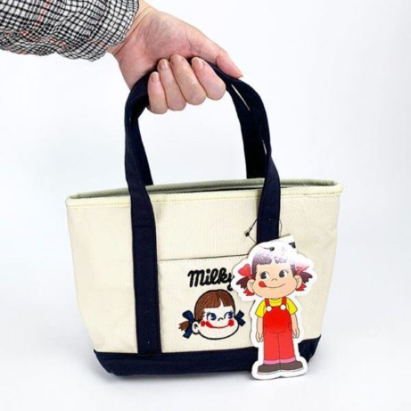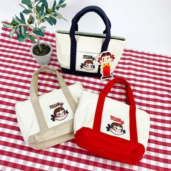 ペコちゃんのミニトートが登場!ネイビー、レッド、ベージュの三色展開。マチが12cmあるので沢山入ります!ペコちゃんの刺繍が施されています。