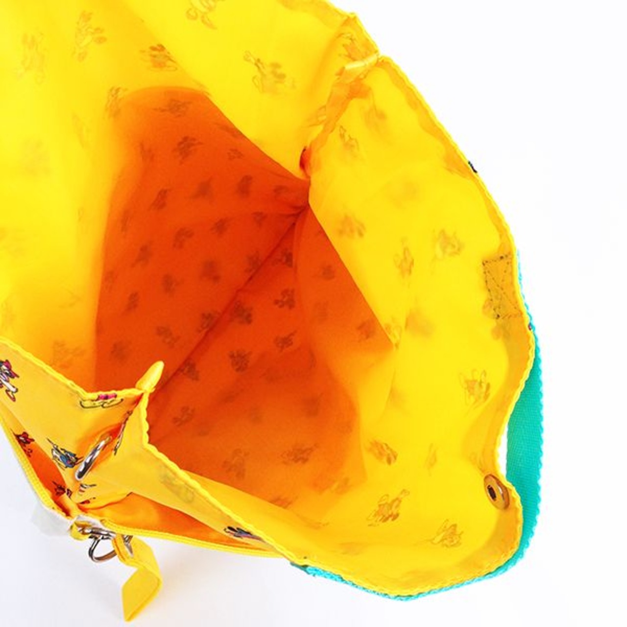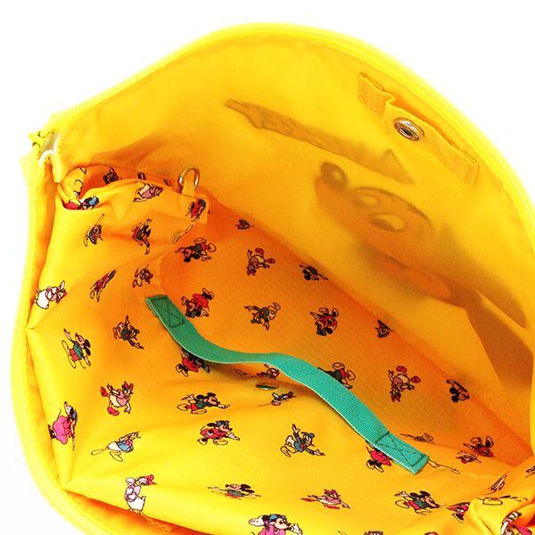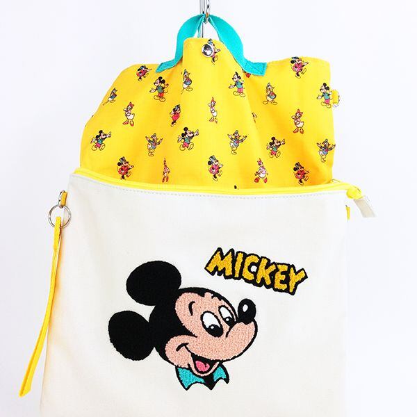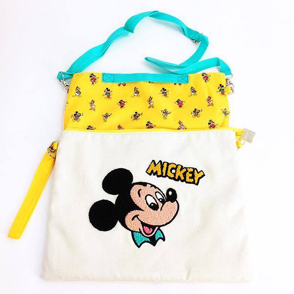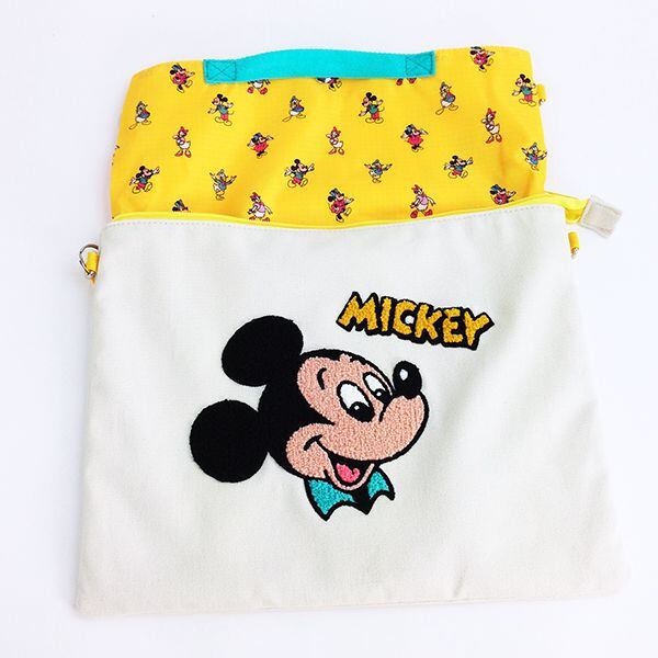 レトロなミッキーとミニーがサガラ刺しゅうで施されたバッグ。3WAYで使用できるデザインもうれしい。バッグの中に折りたたまれたナイロン地部分を伸ばすとA4サイズも収納できるトートバッグに変身!取り外し・長さ調節可能なショルダーも2ヶ所に取り付けられて使い方無限大!