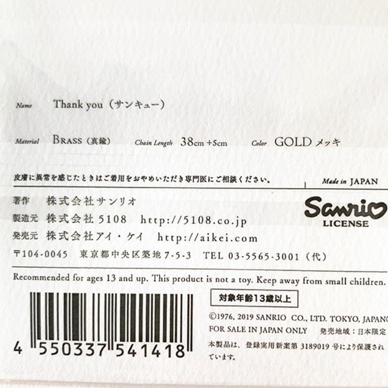 サンリオ ハローキティ HelloKitty×5108”ThankYou”gold ゴールド アクセサリー ネックレス コトバ