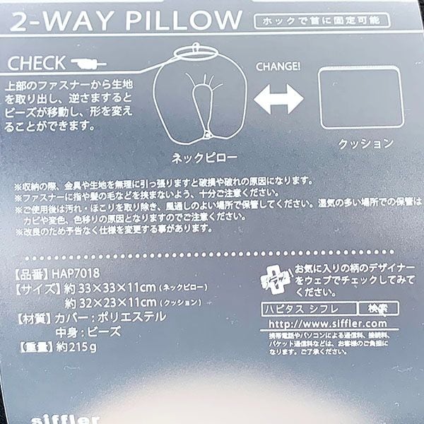 2WAYで使えるネックピローです!上部のファスナーから生地を取り出してひっくり返すと、ビーズが移動しミニクッションにもなります。◆クッションサイズ:縦23×横32×厚み11cm◆サイズ:33cm×33cm×11cm